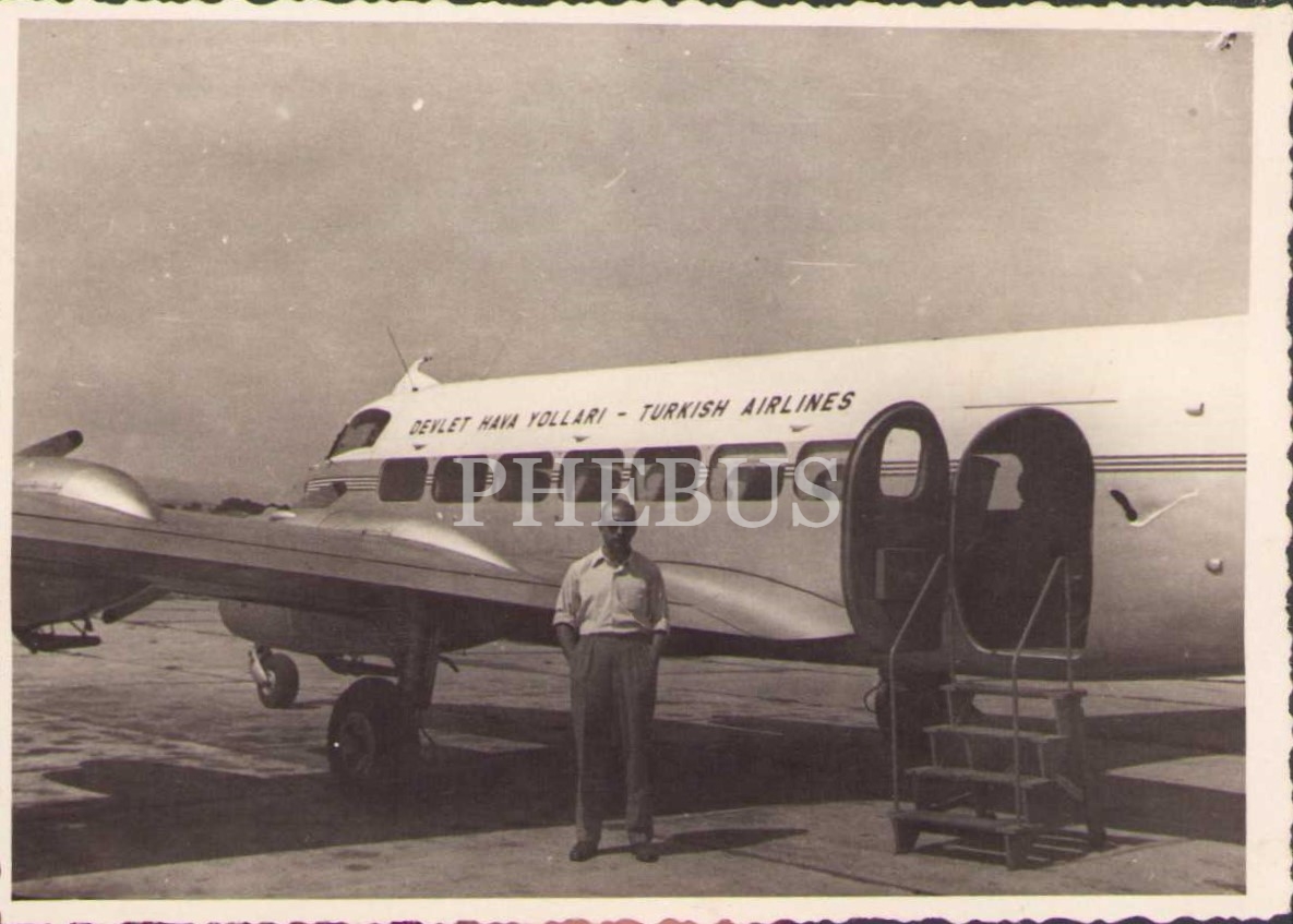 Türk uçağı önünde şahıs hatıra fotoğrafı, 1955 tarihli yazı mevcut, 7x10 cm