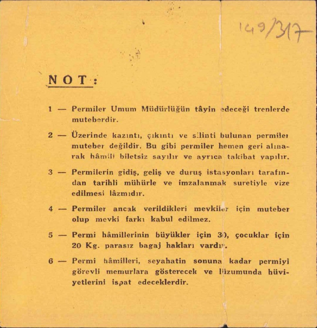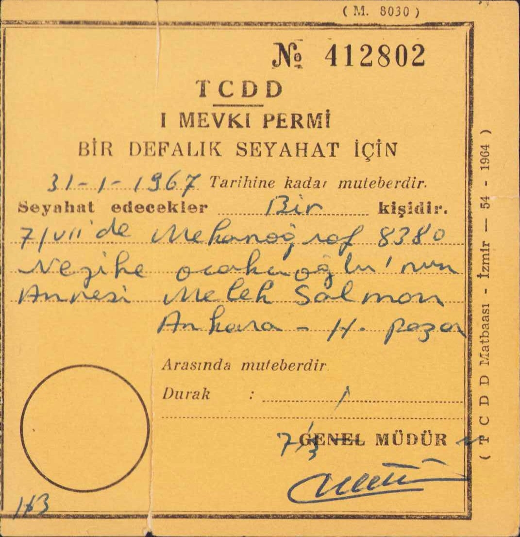 TCDD 1. Mevki Permi bileti, 1867 tarihli, Ankara-Haydarpaşa hattı, 9x9,5cm