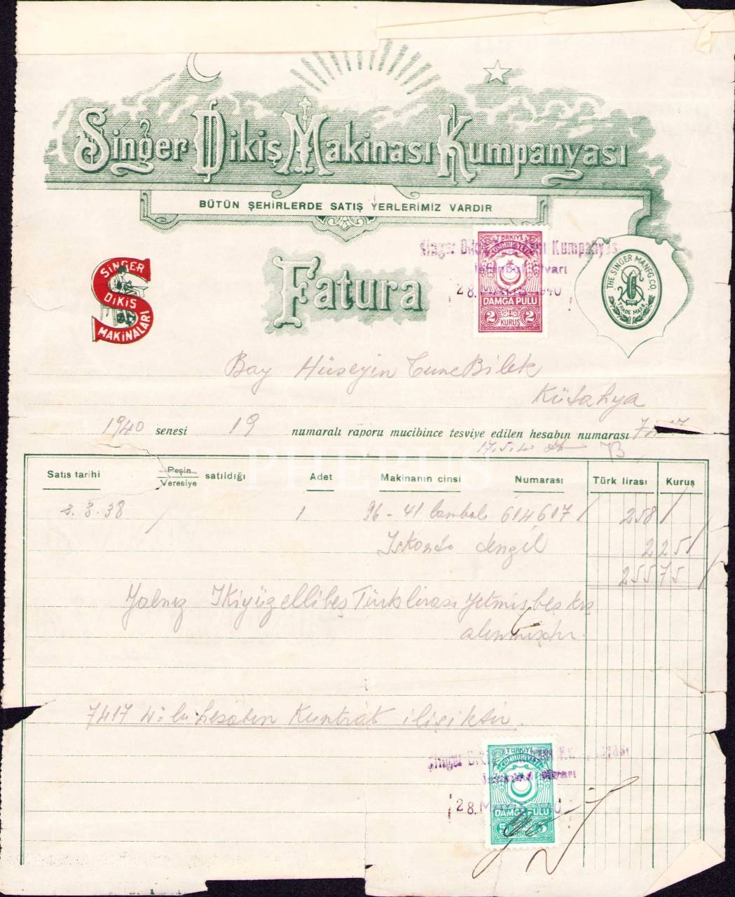 Singer Dikiş Makinasi Kumpanyası'na ait fatura, 1940 tarihli, 21x27 cm, epey yıpranmış haliyle