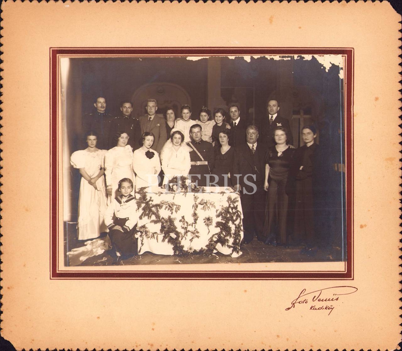 Düğün hatıra fotoğrafı, Foto Venüs-Kadıköy damgalı, foto: 17x23 cm, paspartu köşeleri ve fotoğraf kenarı yıpranmış haliyle
