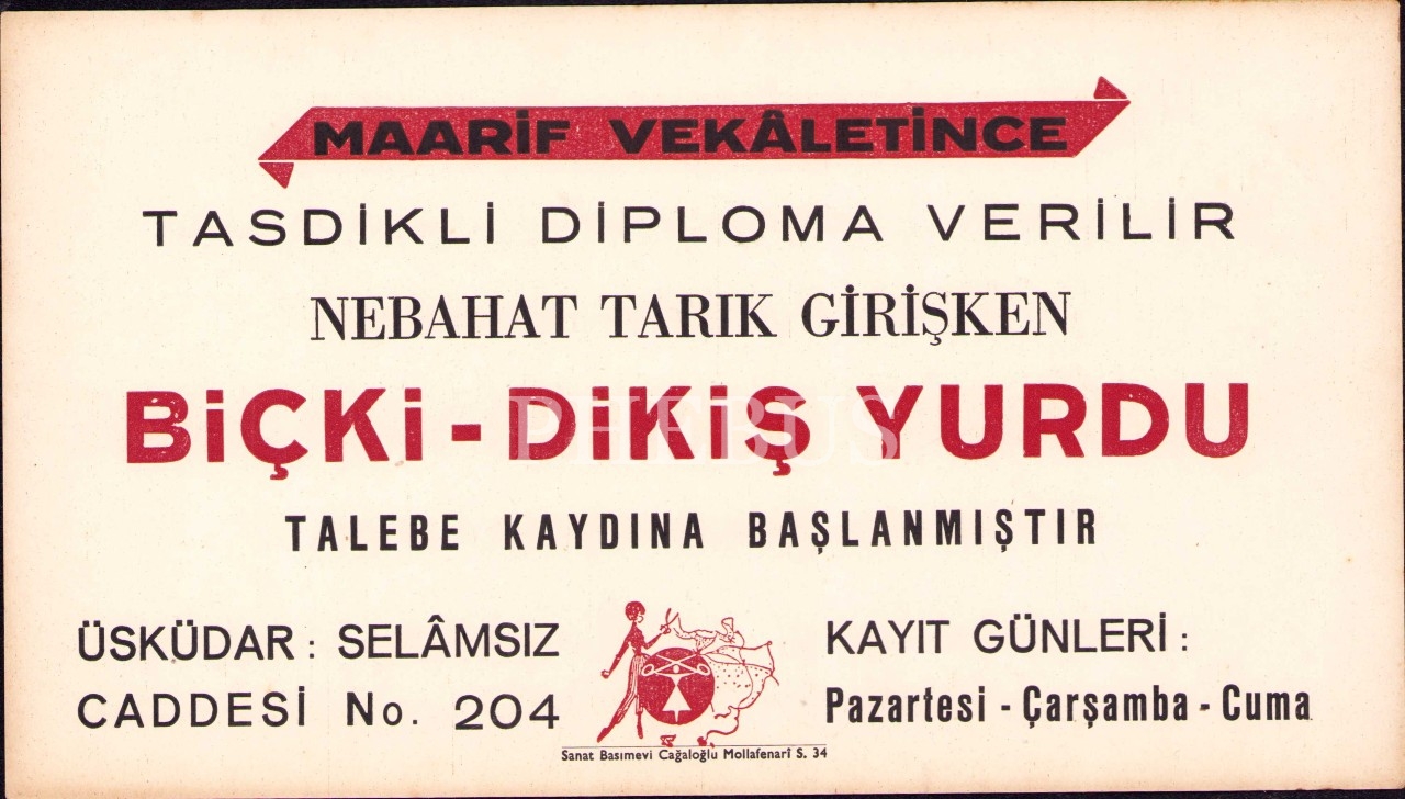 Nebahat Tarık Girişken Biçki-Dikiş Yurdu reklam kartı, 16x28 cm