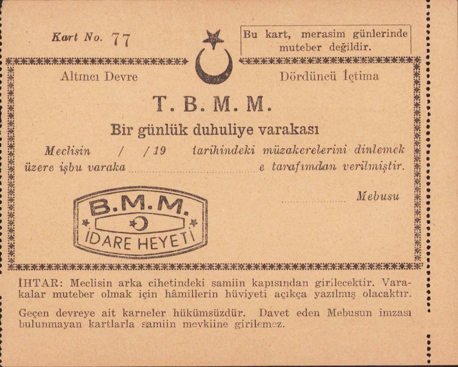 TBMM Bir Günlük Duhuliye Varakası, matbu BMM İdare Heyeti damgalı, 12x10cm