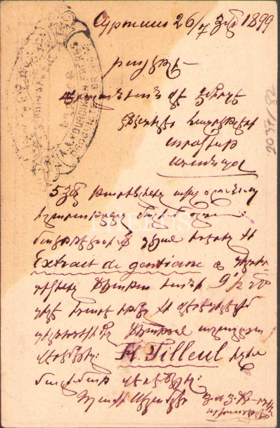 1899 tarihli Fransızca(?) mektup kartı, 9x13 cm, su almış haliyle
