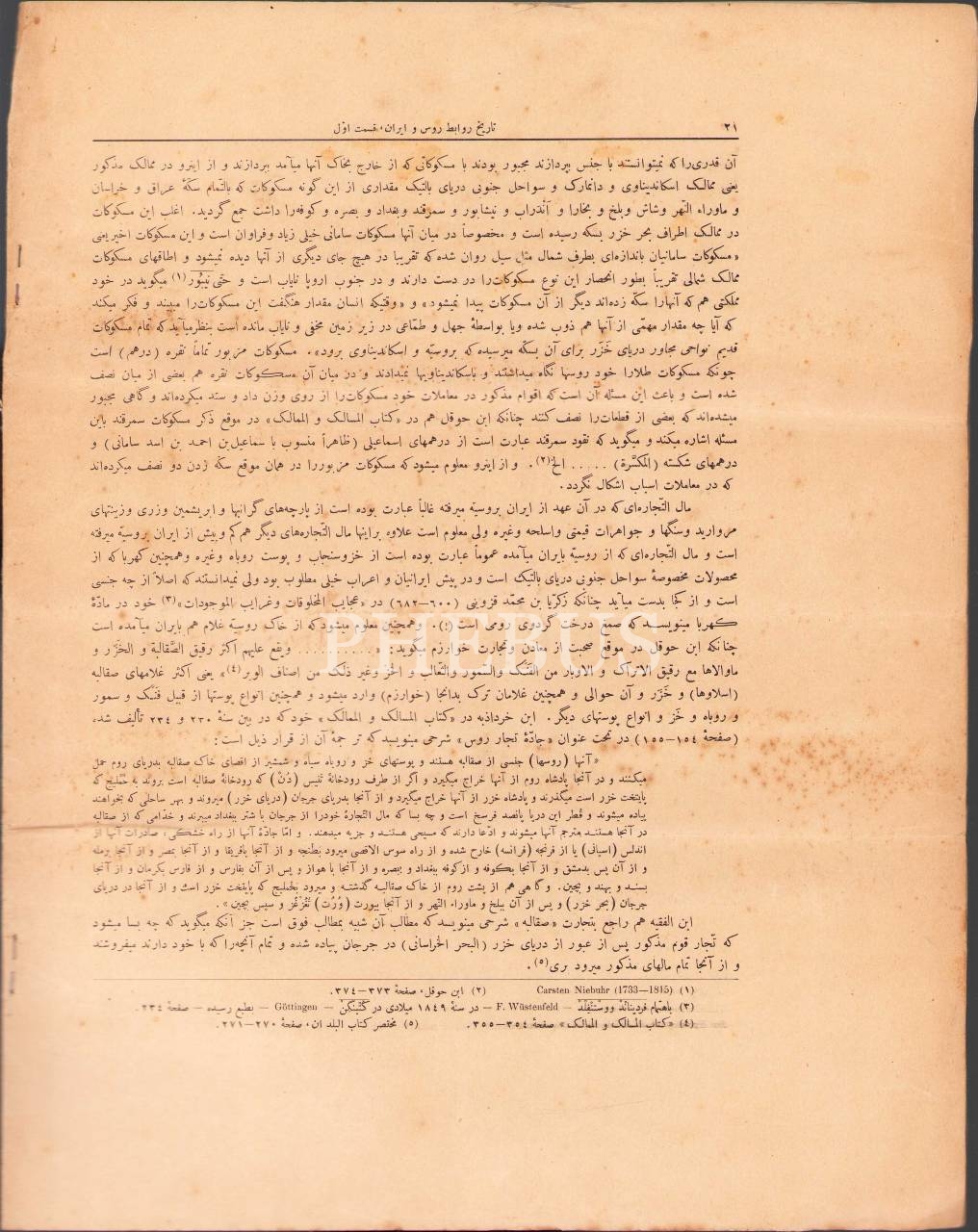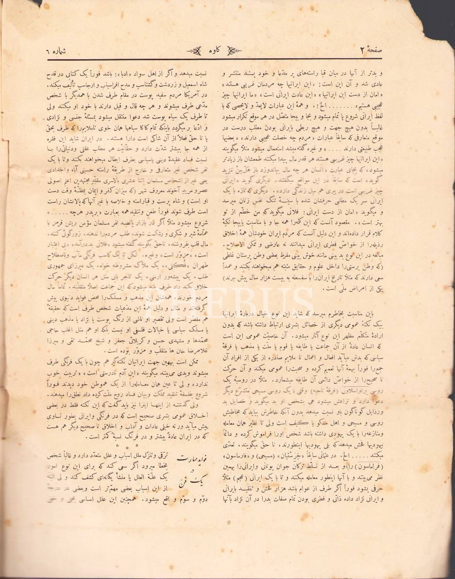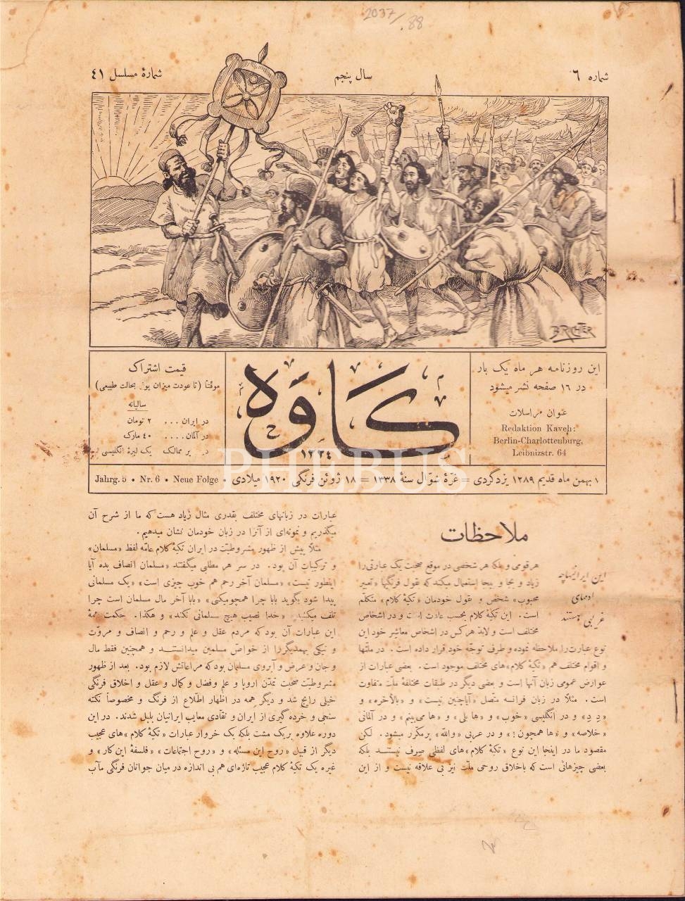 Farsça Kâve dergisi 6. sayı, 18 Haziran 1920, "En Eski Rusya-İran İlişkileri" başlıklı bölüm ekiyle, 8+8 sayfa, 28x35 cm, yıpranmış haliyle