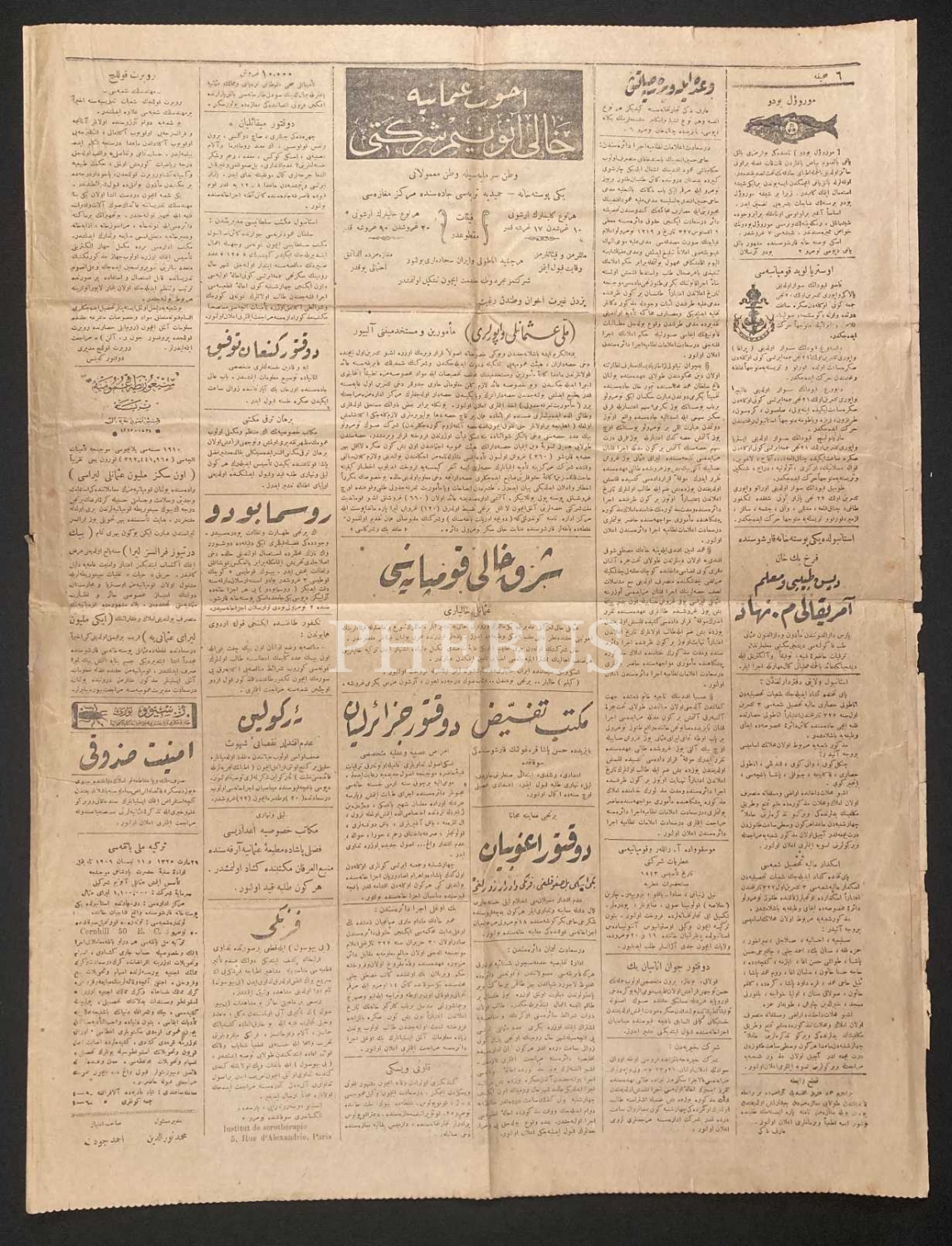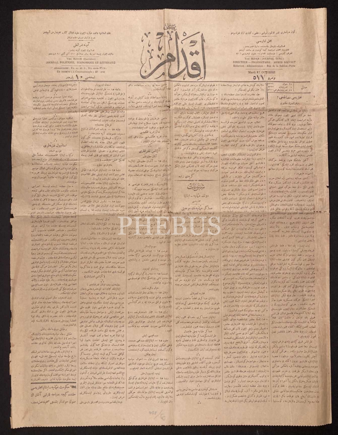 Osmanlıca İkdam gazetesi 577. sayı, 17 Teşrinievvel 1911, 6 sayfa, 45x59 cm, kenarları yıpranmış haliyle