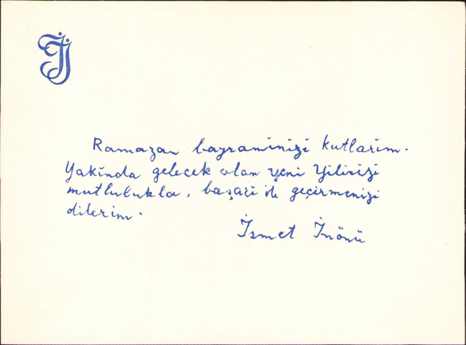 İ.İ. [İsmet İnönü] inisiyalli bayram tebrik kartı, 11x15 cm, üst köşesi hafif kıvrık haliyle