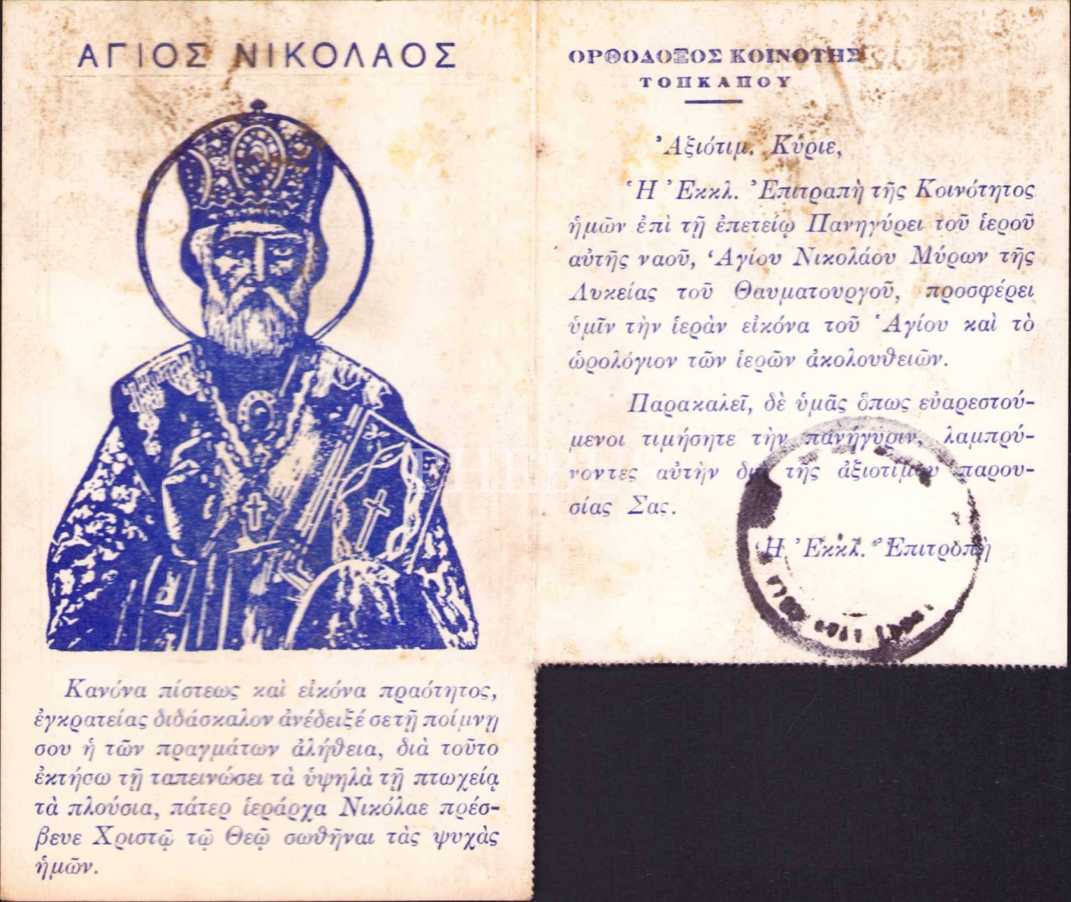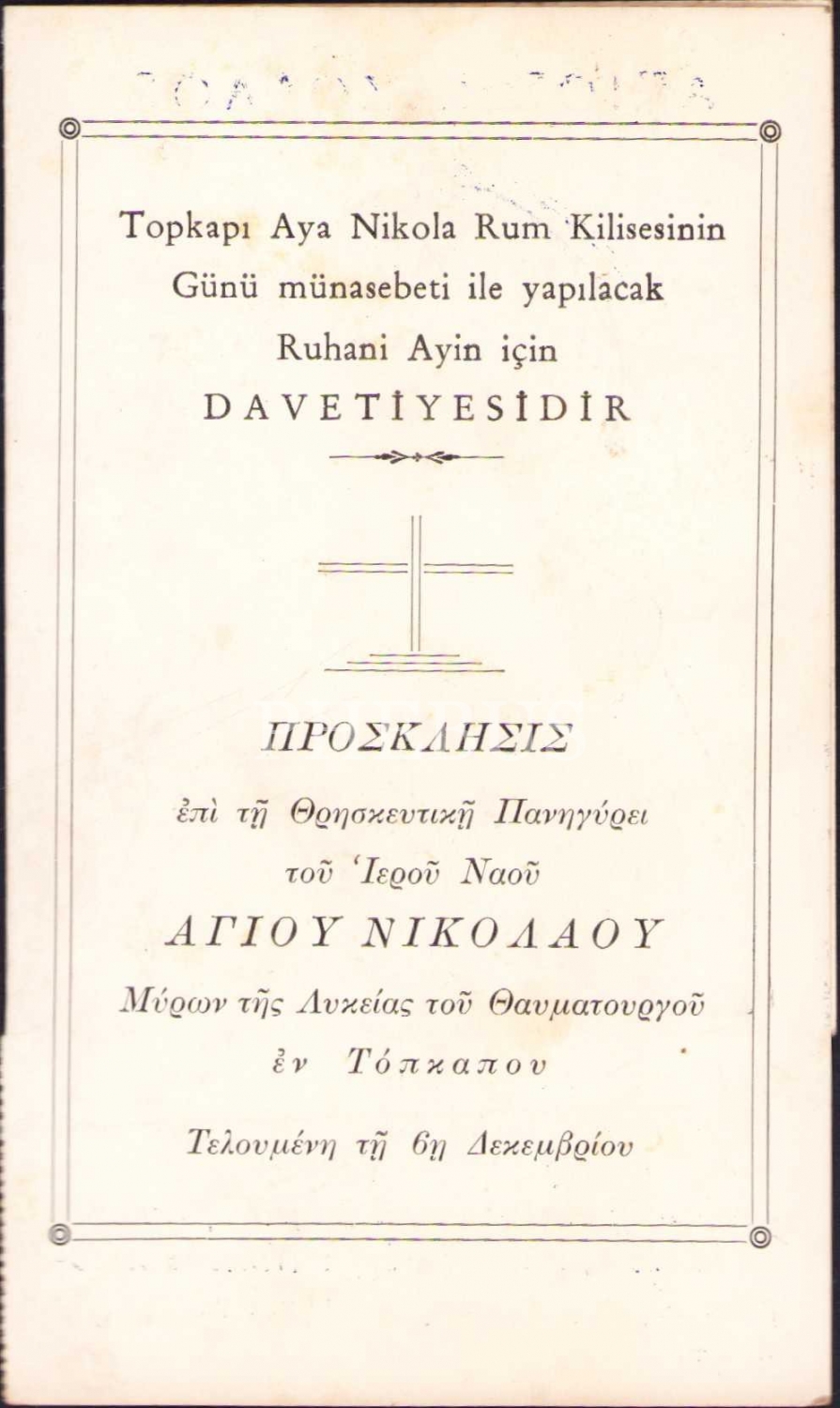 Topkapı Aya Nikola Rum Kilisesi'nin ruhani ayin davetiyesi, Türkçe-Rumca, 8x14 cm