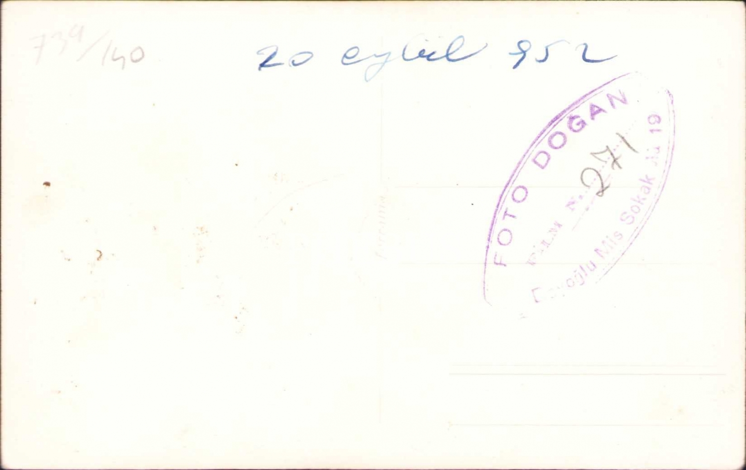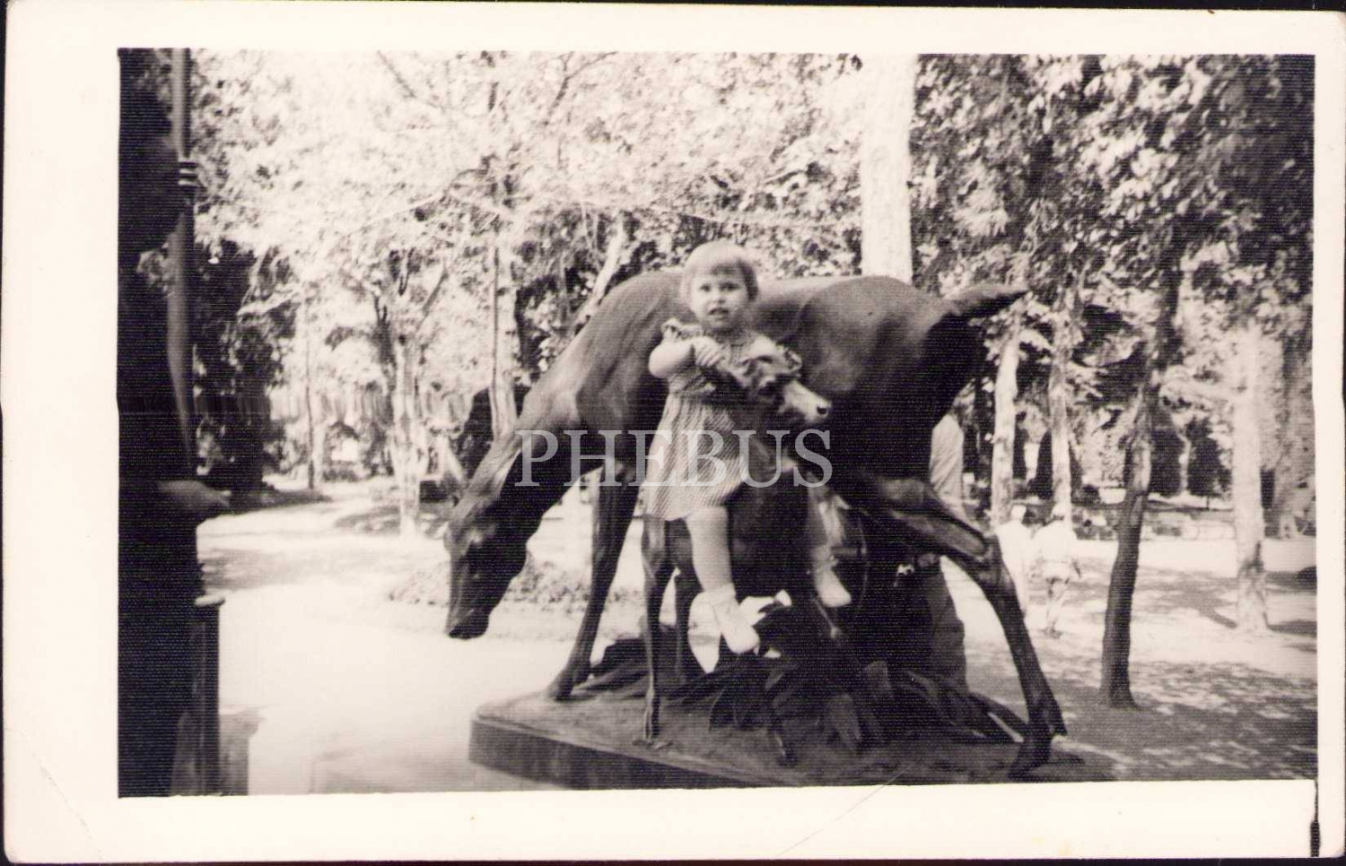 Günümüzde Emirgan Korusu'nda bulunan "Su İçen Dişi Geyik ve Yavrusu" heykeli ile hatıra fotoğrafı, Taksim Gezi Parkı, 1952 tarihli, Foto Doğan - Beyoğlu damgalı, alt köşesi kırık haliyle