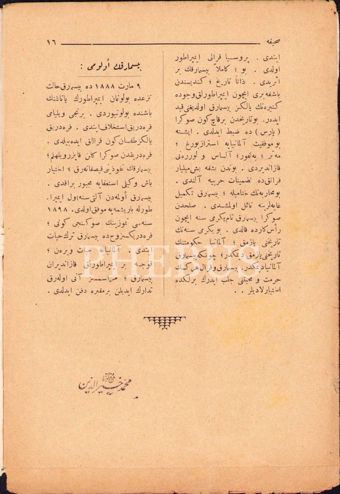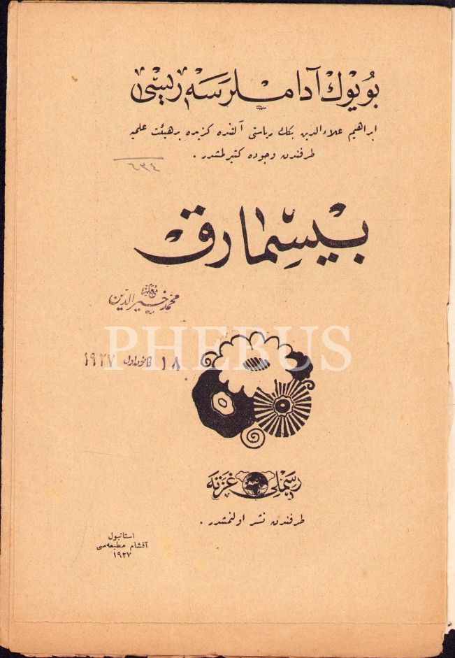 Osmanlıca Resimli Gazete yayınlarından Büyük Adamlar Serisi: Bismarck, Akşam Matbaası, İstanbul 1927, 16 s., 14x20 cm, kenarları yıpranmış haliyle