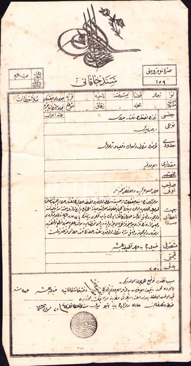 Osmanlıca Sened-i Hakani antetli arz-ı miri tarla tapusu, Yenişehir-Fener/Tırhala 1298, 17x33 cm, lekelenmiş ve kırışık haliyle