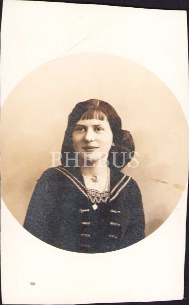 Genç hanımefendi fotoğrafı, arkası yazılı, 6x10 cm, kenarlardan kesilmiş haliyle