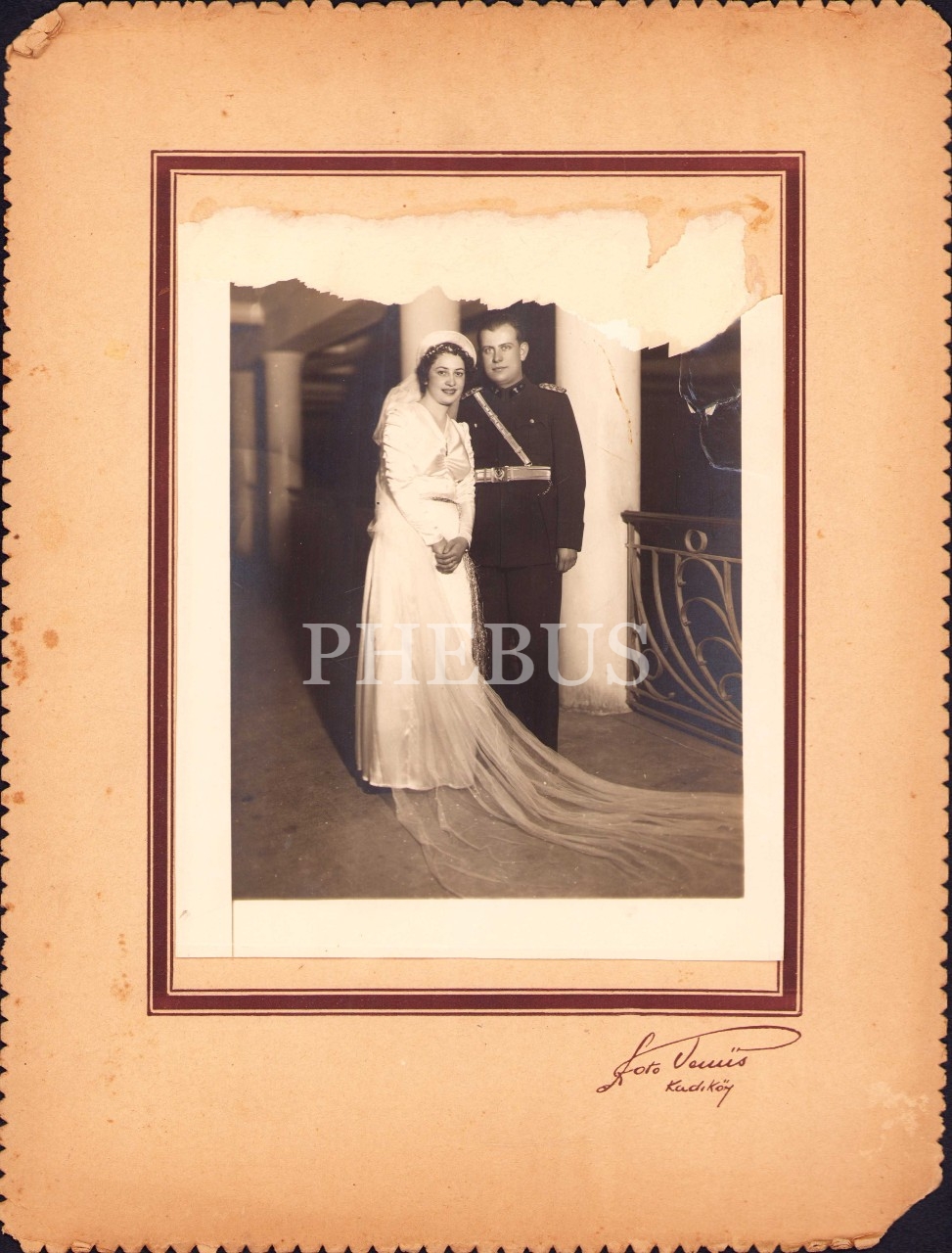 Düğün hatıra fotoğrafı, Foto Venüs-Kadıköy, paspartulu, foto: 17x21 cm, epey yıpranmış haliyle
