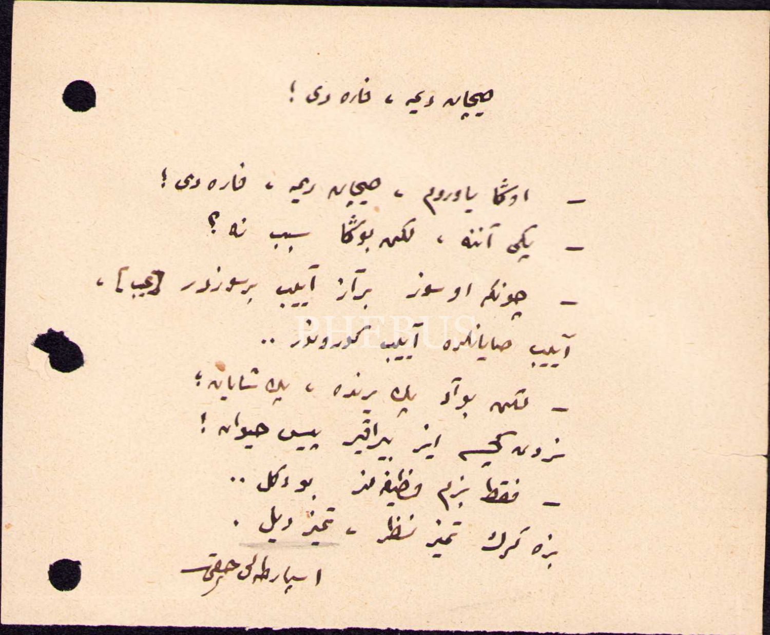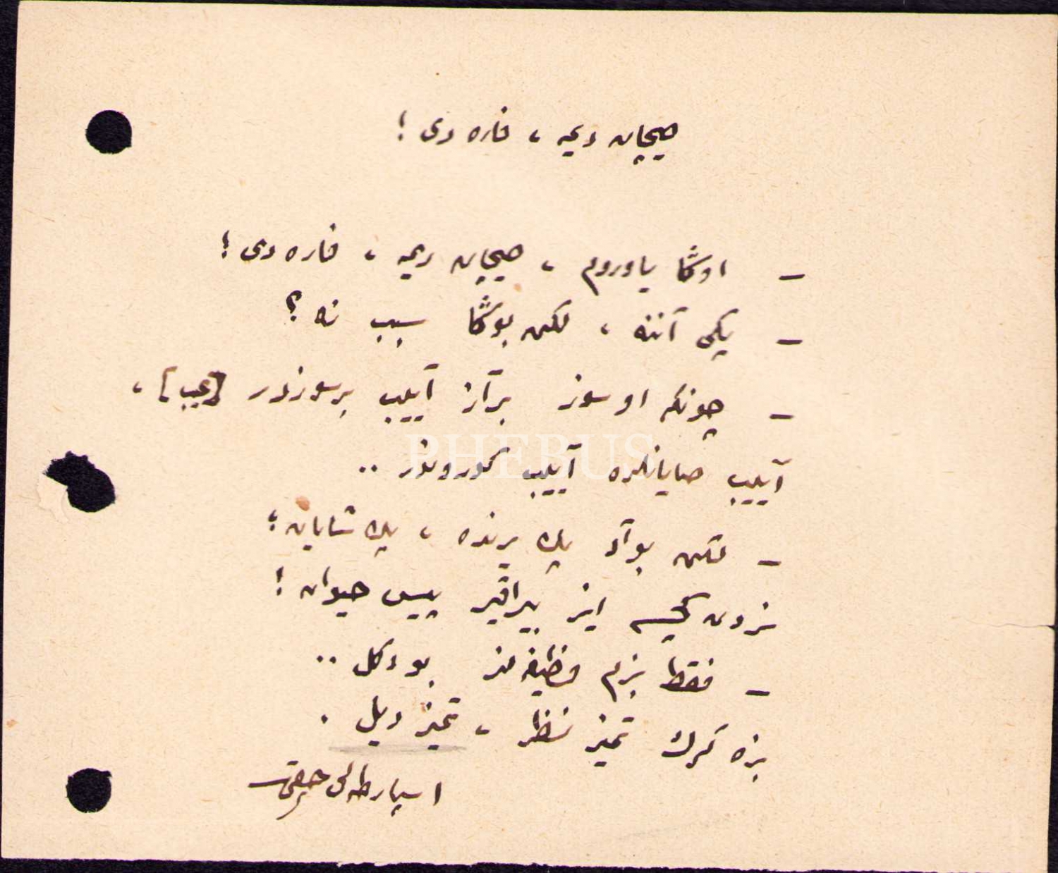 Yazar ve siyasetçi Ispartalı Hakkı imzalı Osmanlıca "Sıçan Deme, Fare De!" başlıklı metin, 10x13 cm, hafif yıpranmış haliyle