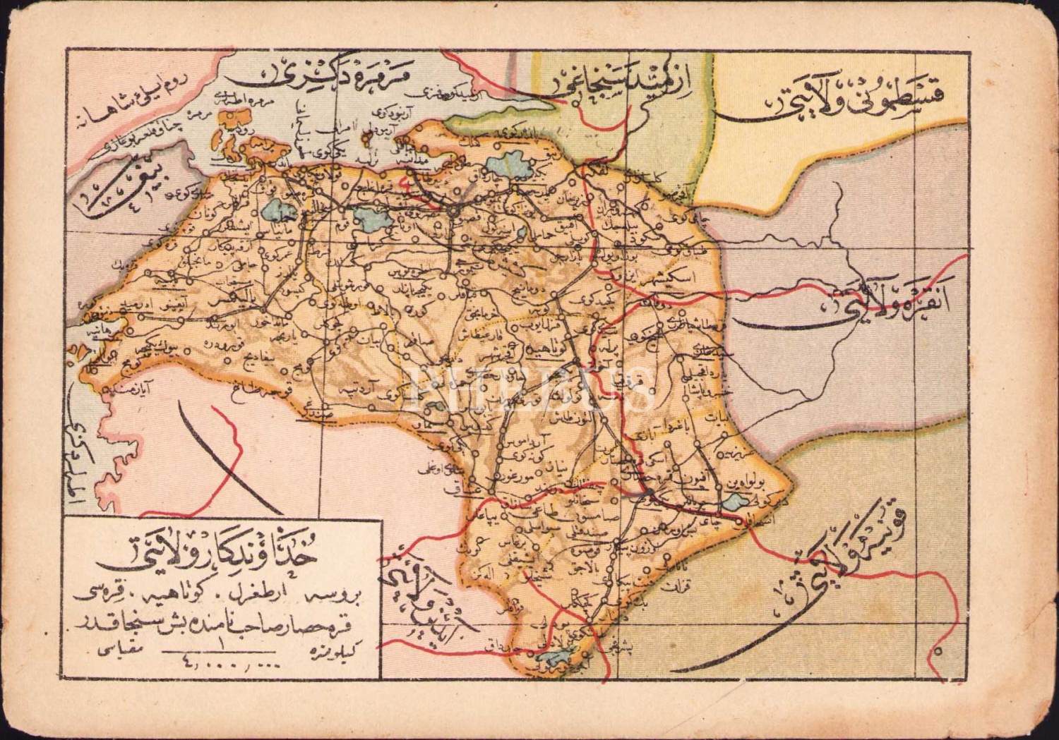Osmanlıca Hüdavendigar [Bursa] Vilayeti haritası, alt köşesi kırık ve kenarları hafif yıpranmış haliyle