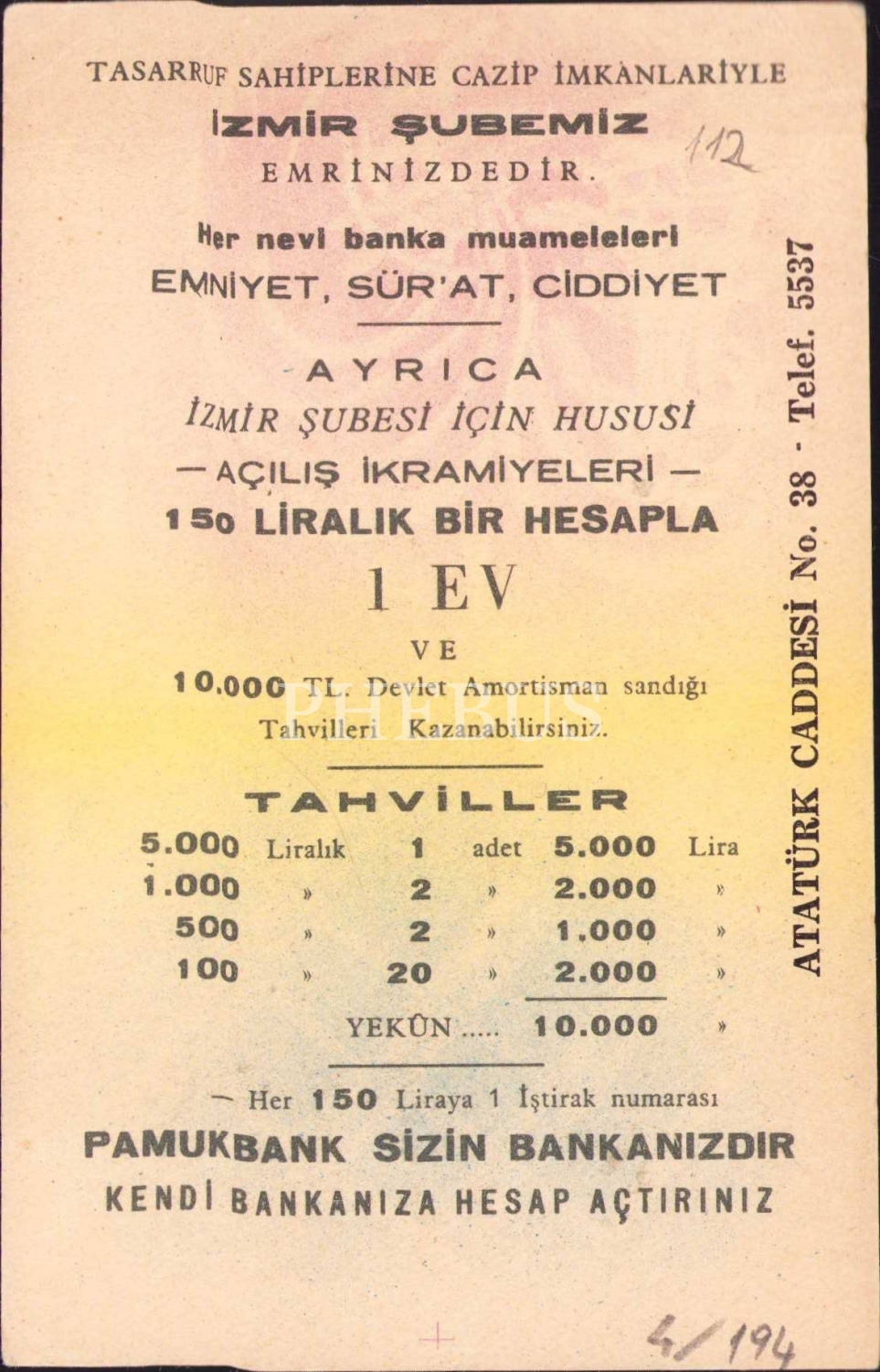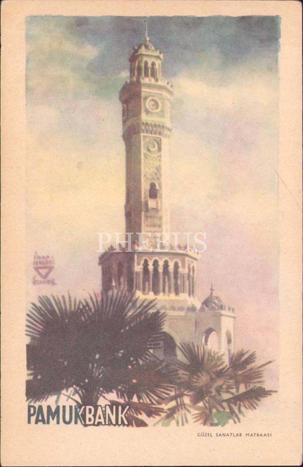 İhap Hulusi imzalı görseliyle Pamukbank reklam kartı, İzmir Saat Kulesi görselli, üst kısmı yıpranmış haliyle