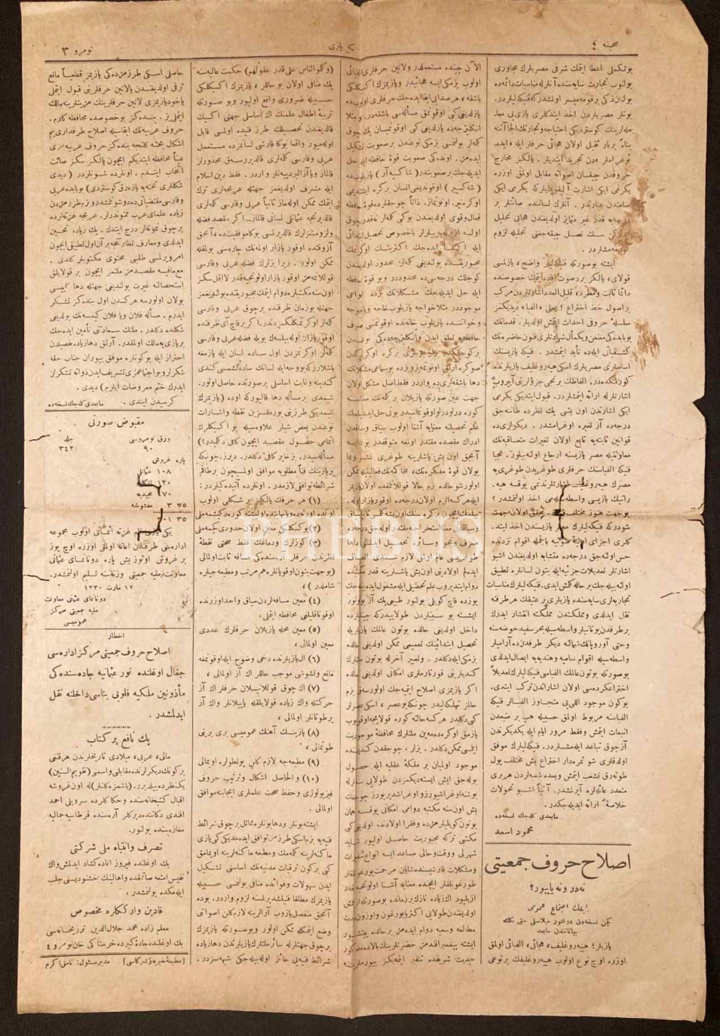 Osmanlıca Yeni Yazı dergisi 3. sayı, 21 Mart 1330, 4 sayfa, 31x46 cm, kurt yenikleri mevcut ve yıpranmış haliyle