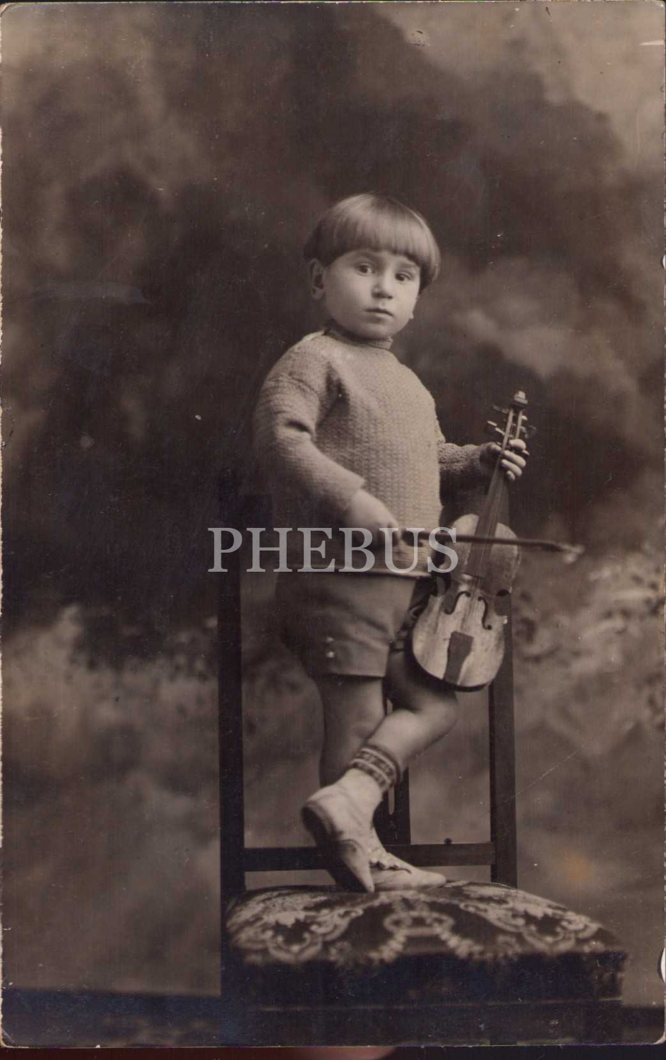 Elinde kemanla poz veren erkek çocuğu, kenarları hafif soyulmuş haliyle