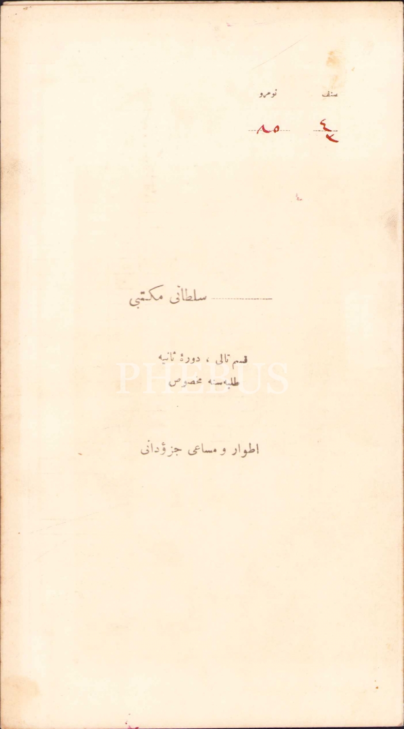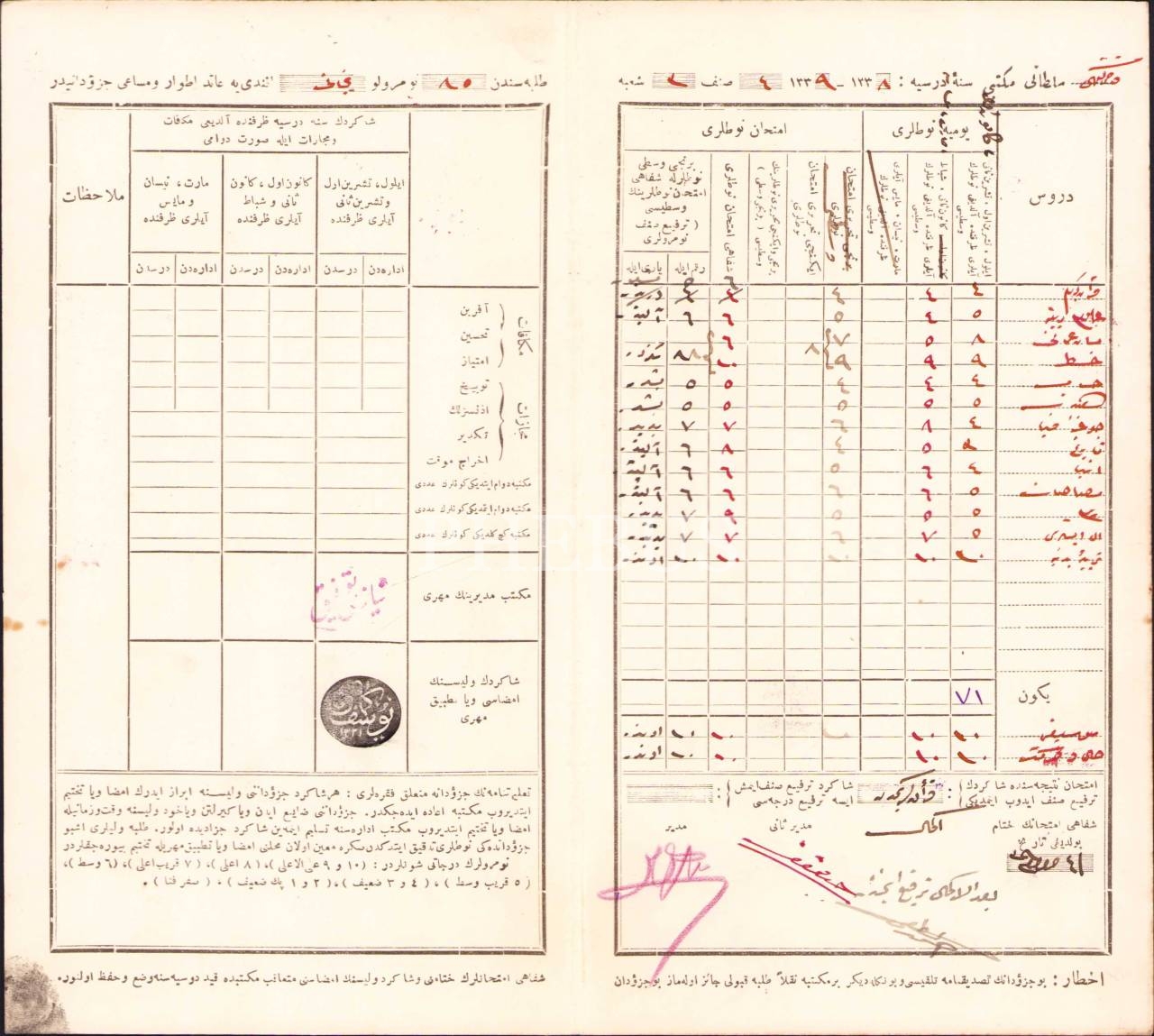 Osmanlıca Kadıköy Sultani Mektebi etvar ve mesai cüzdanı [öğrenci karnesi], 1338-39 eğitim yılına ait, 21x23 cm, lekelenmiş haliyle