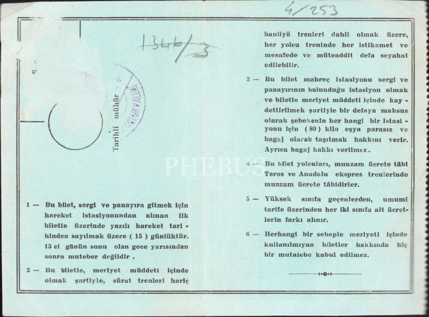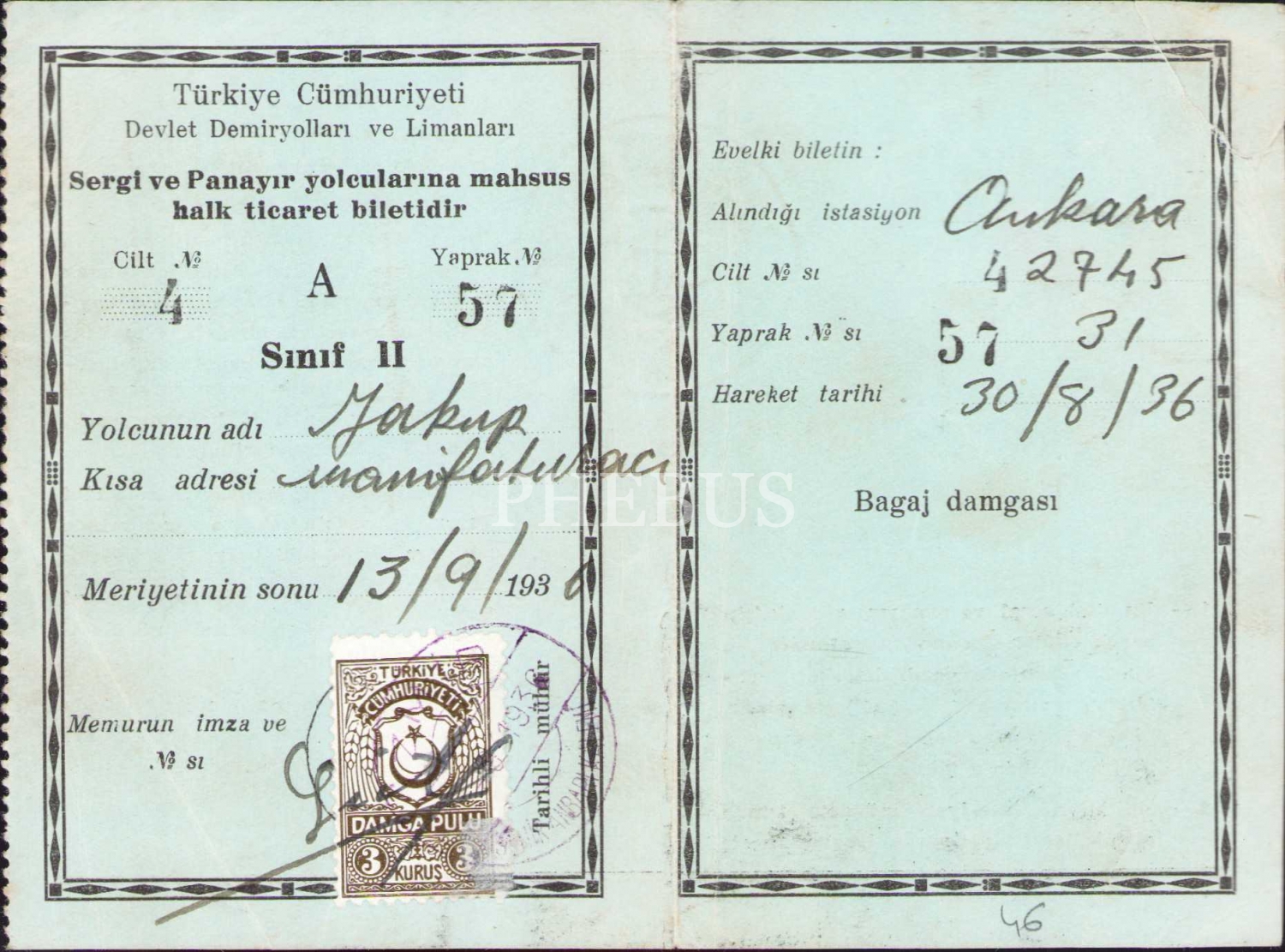 Türkiye Cümhuriyeti Devlet Demiryolları ve Limanları'na ait sergi ve panayır yolcuları halk ticaret bileti, 1936 tarihli, 11x16 cm, yıpranmış haliyle