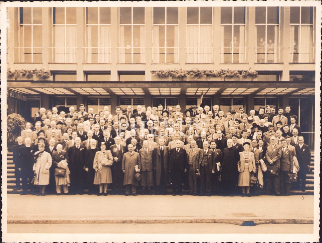 İsviçre'de uluslararası bir kongreye katılan, aralarında Fahrettin Kerim Gökay'ın da bulunduğu bir grup delegenin hatıra fotoğrafı, arkası Osmanlıca yazılı, 17x23 cm