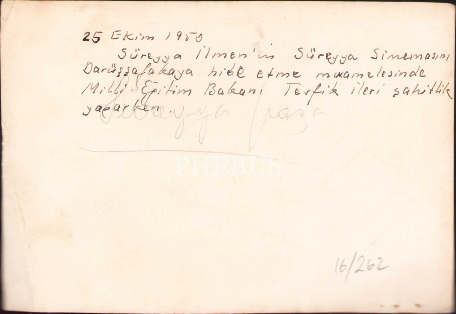 Süreyya Sineması'nın Milli Eğitim Bakanı Tevfik İleri şahitliğinde Darüşşafaka'ya hibe muamelesi gerçekleşirken, 1950 tarihli, hafif yıpranmış haliyle