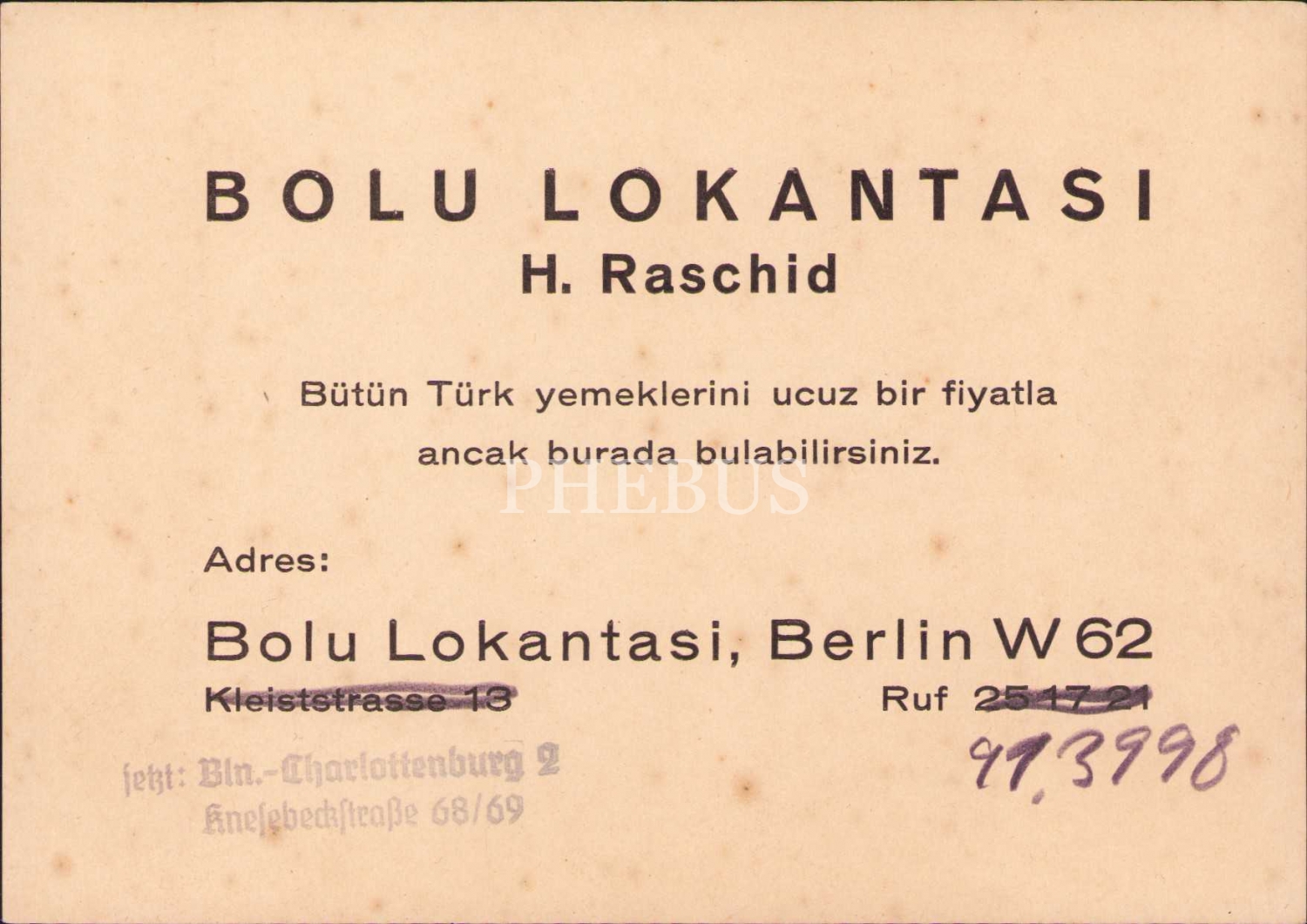 Bolu Lokantası H. Raschid reklam kartı, Berlin, 10x15 cm, yorgun haliyle