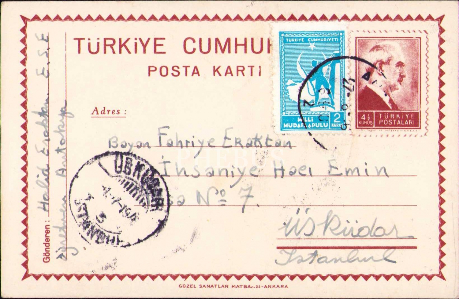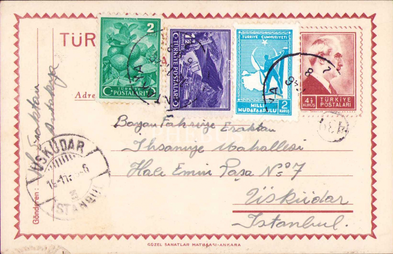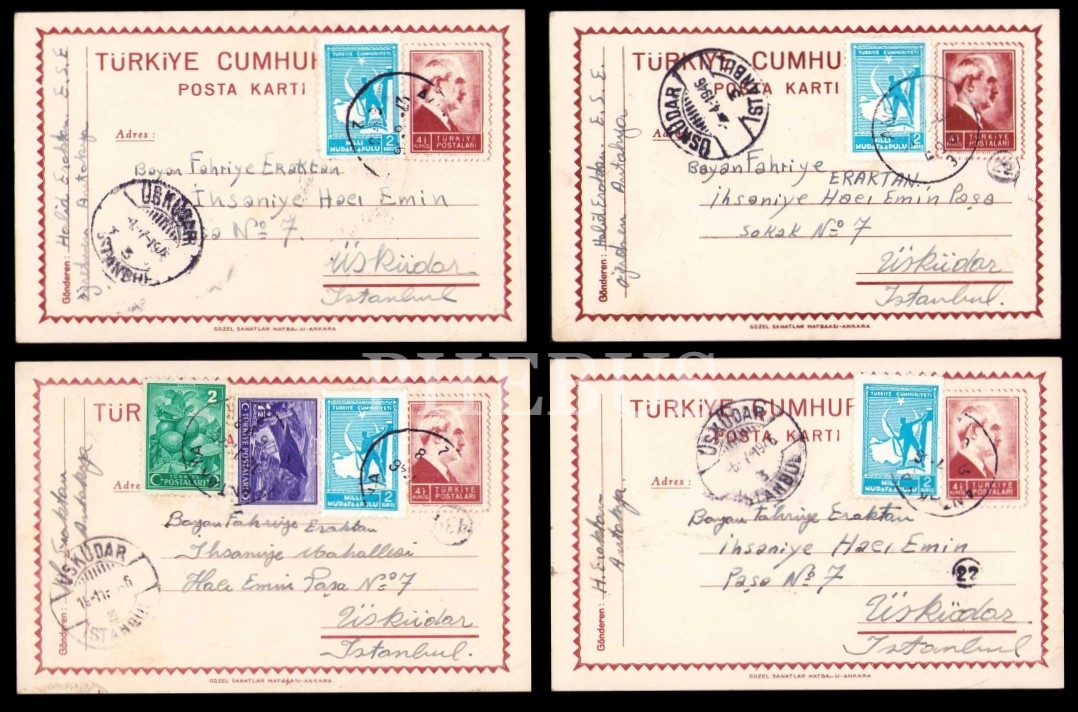 Fahriye Eraktan alıcılı ve 1946 tarihli dört adet mektup kartı, Antakya-İstanbul, postadan geçmiş, ikisi hafif yıpranmış haliyle