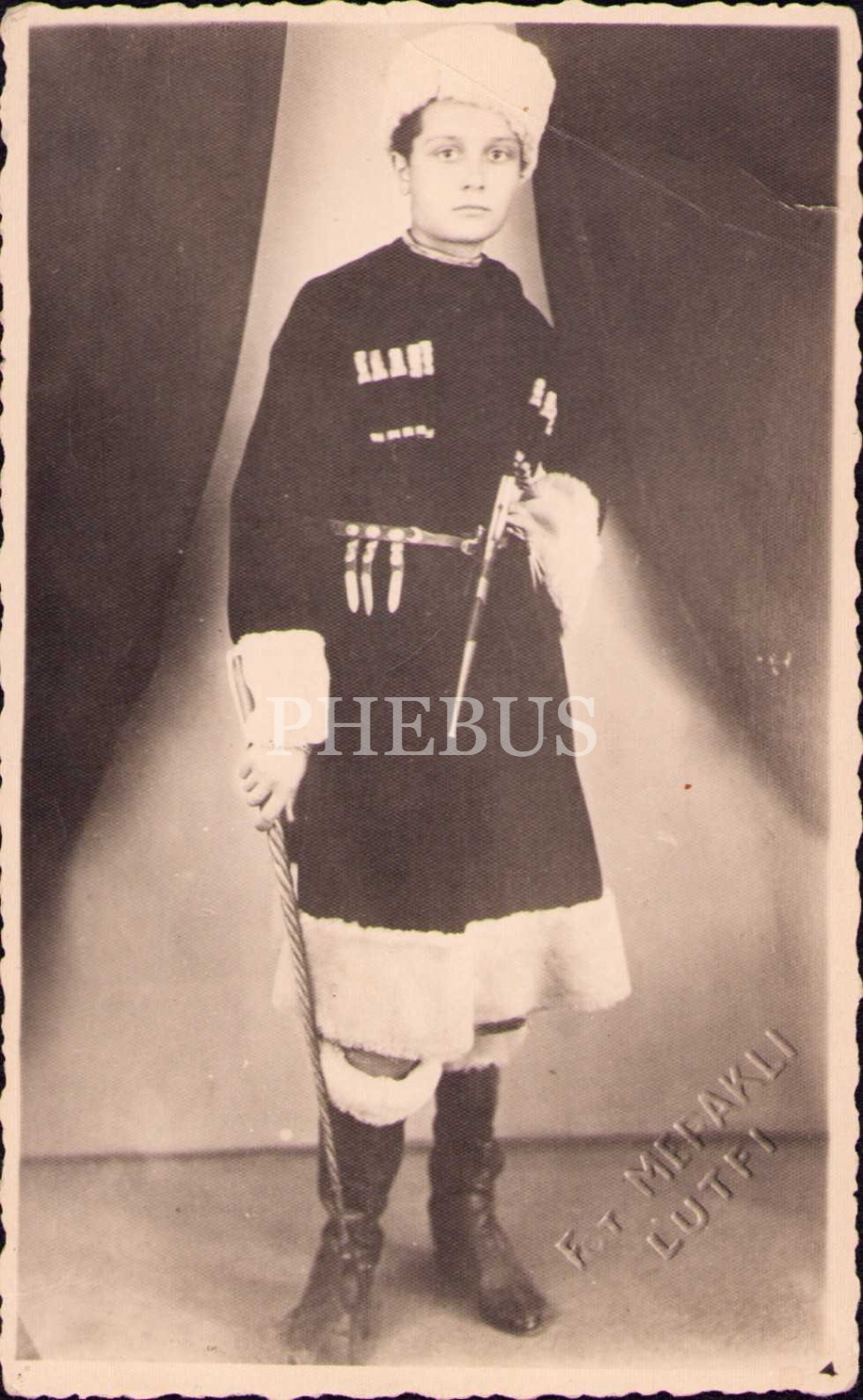 Yöresel Kafkas kıyafeti içinde poz veren erkek çocuğu, Fot. Mepaklı Lütfi, Kadıköy 1942, üst köşesi kırık haliyle