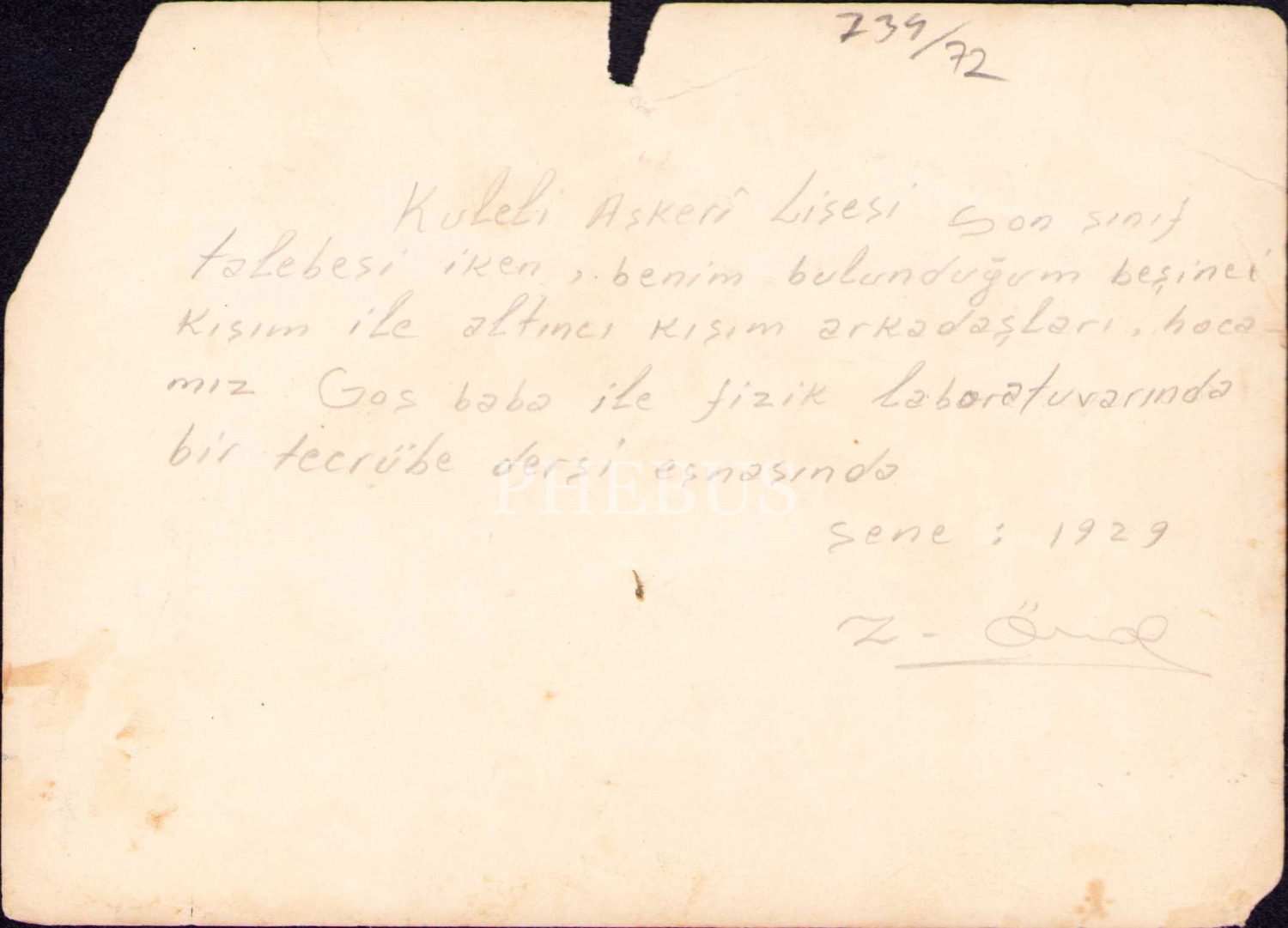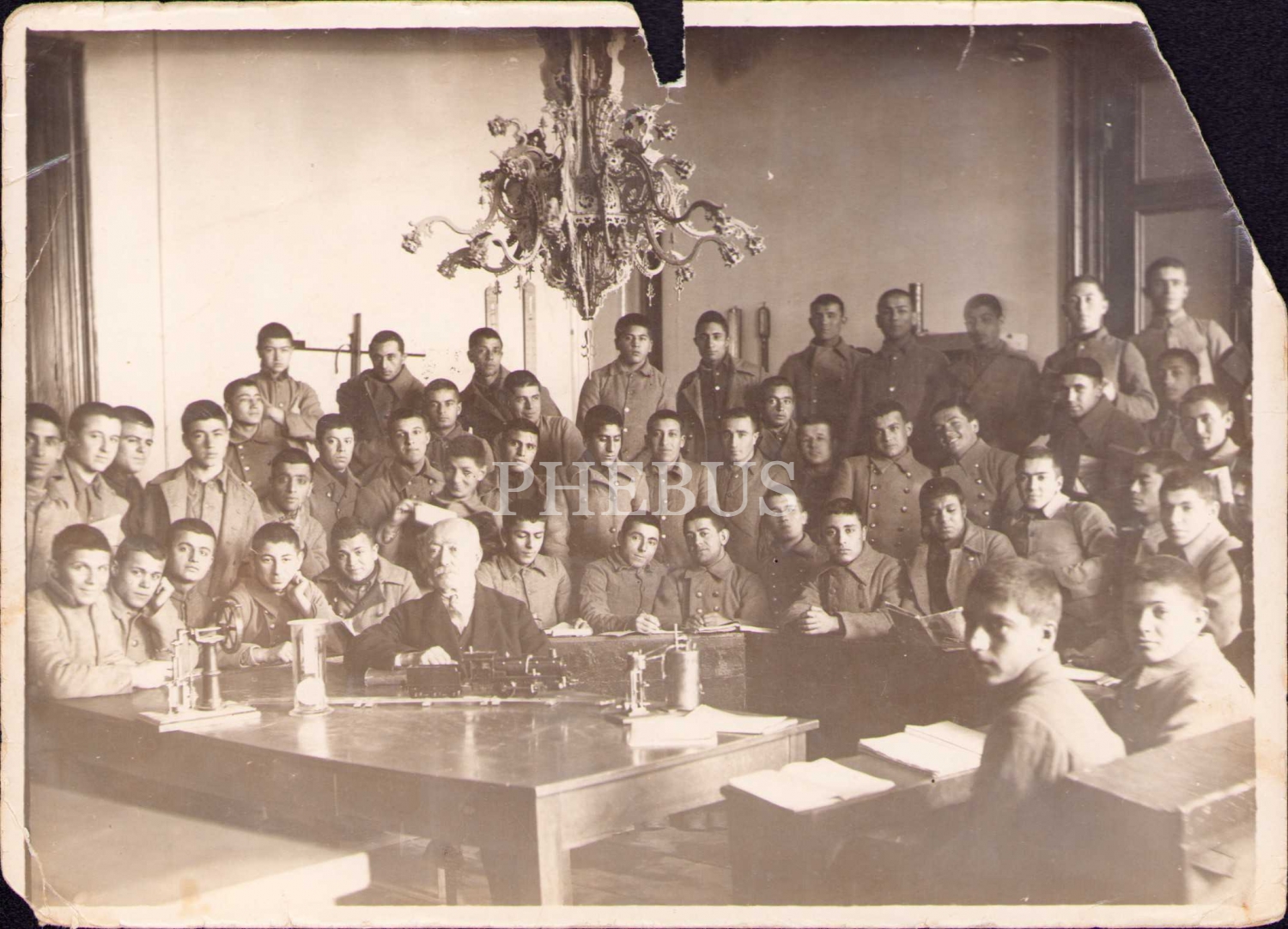 Kuleli Askerî Lisesi fizik laboratuvarında toplu hatıra fotoğrafı, 1929 tarihli, 13x18 cm, epey yıpranmış haliyle