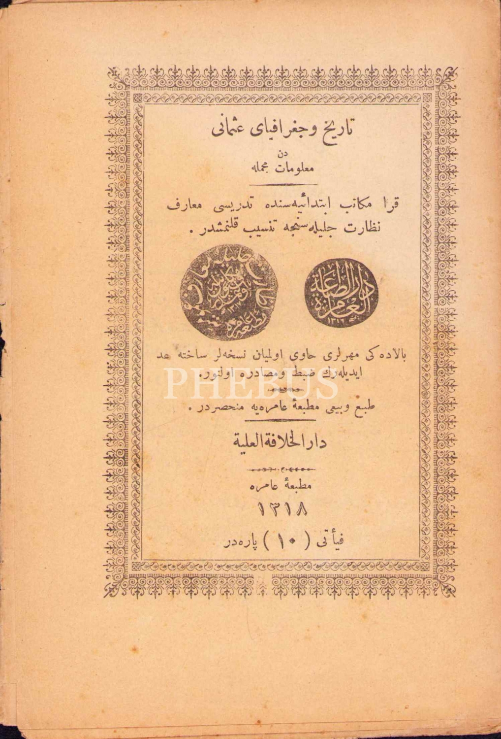 Osmanlıca Tarih ve Coğrafya-yı Osmanî'den Malumat-ı Mücmele [Osmanlı Tarihi ve Coğrafyası Hakkında Bilgiler], Amire Matbaası, İstanbul 1318, 31 s., 12x18 cm, sayfaları açılmamış ve kenarları hafif yıpranmış haliyle