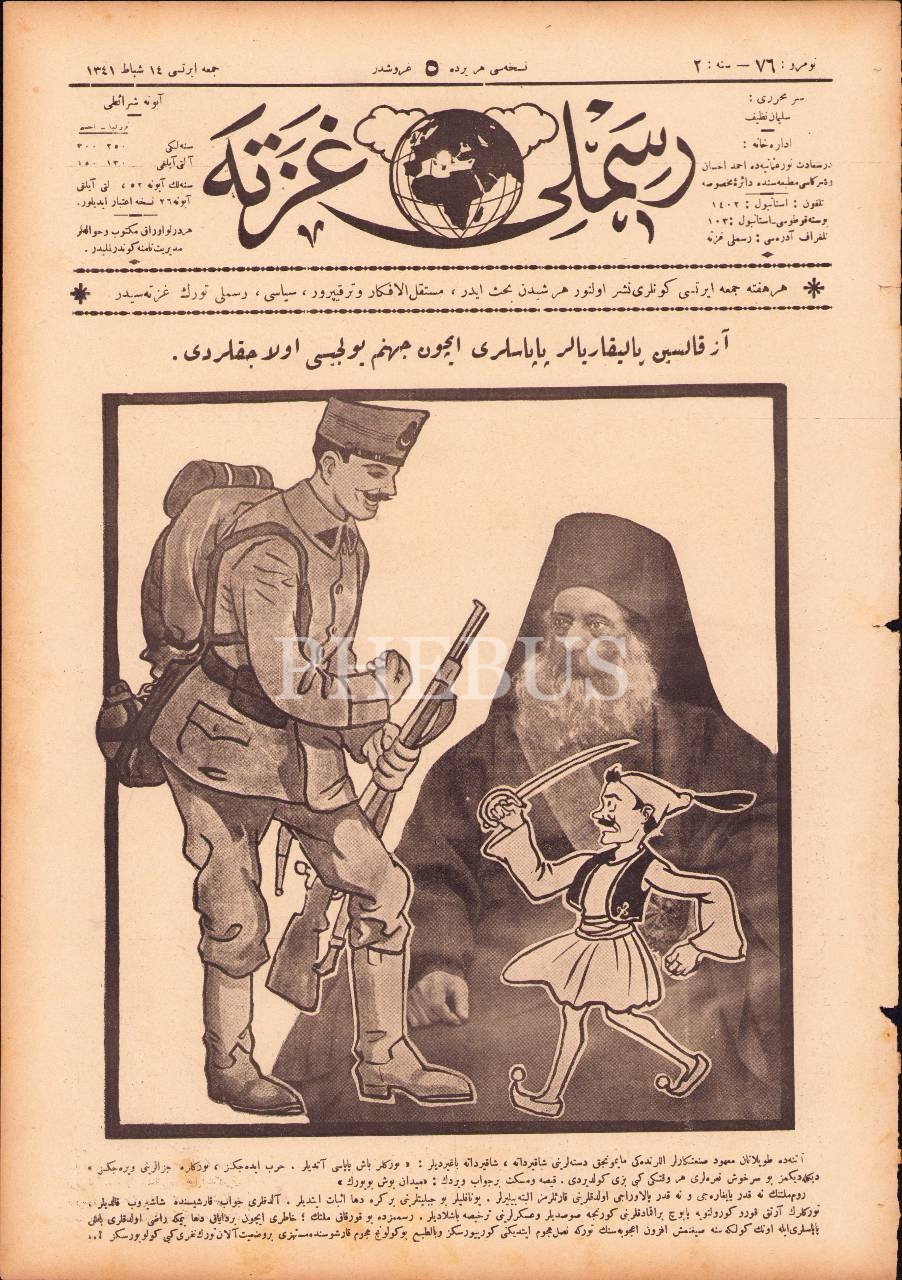 Osmanlıca Resimli Gazete 76. sayı, 14 Şubat 1341, Mustafa Kemal Atatürk ve beraberinde Latife Hanım ile Fahreddin Paşa'ya ait arka kapak görseliyle, 27x39 cm, sırtı epey yıpranmış haliyle