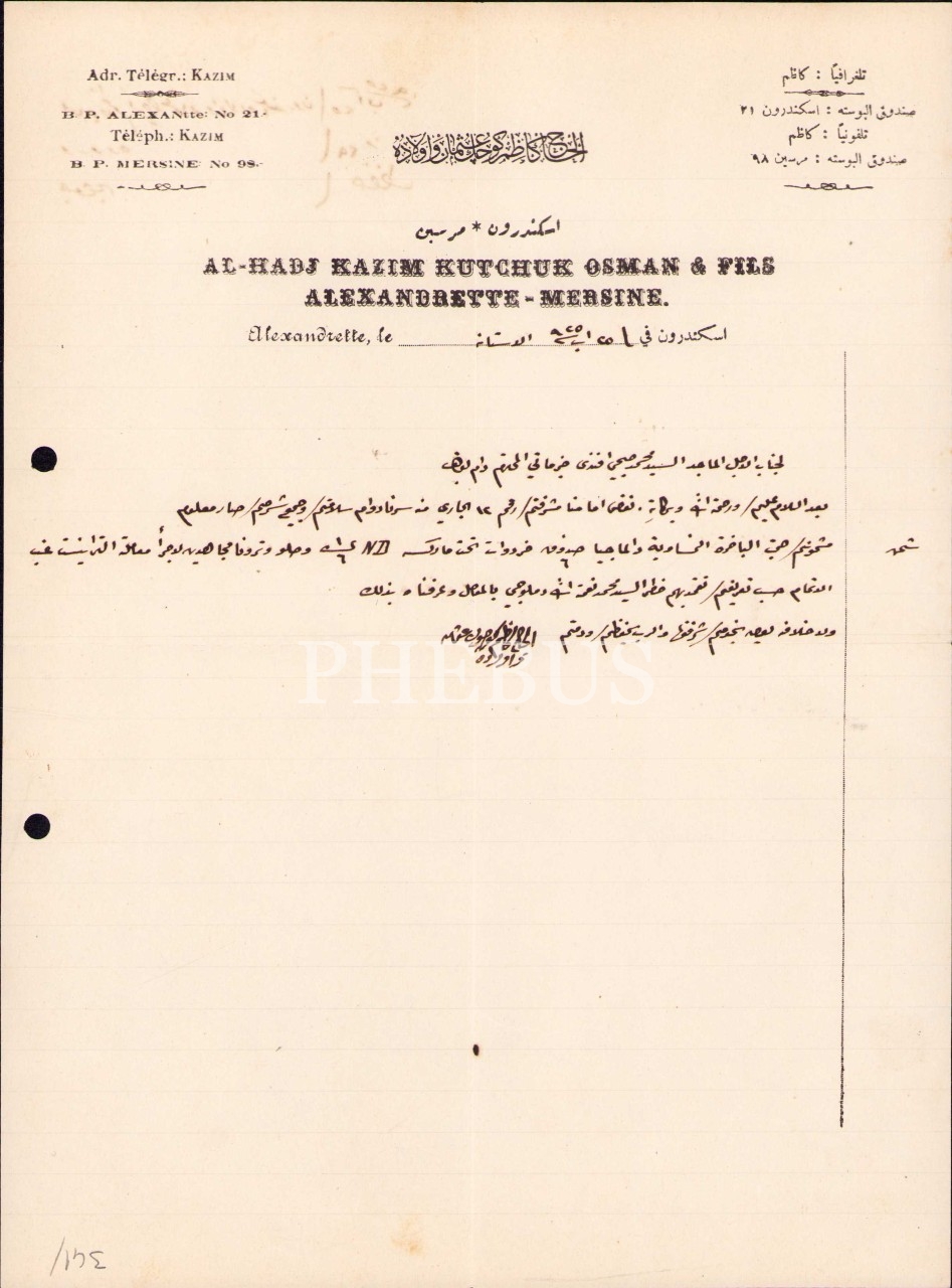 Osmanlıca-Fransızca el-Hac Kazım Küçük Osman ve Evladuhu [Evlatları] antetli kâğıtta Arapça mektup, İskenderun 1925, 20x28 cm