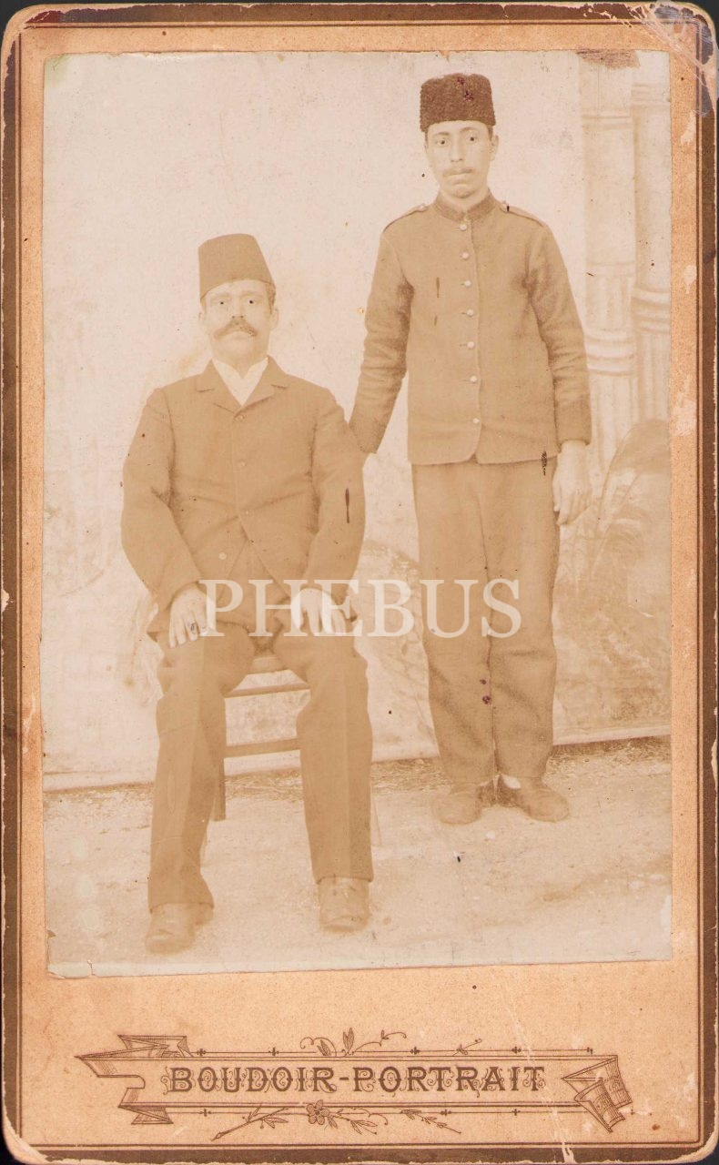 Genç asker ile fesli beyefendinin hatıra fotoğrafı, 13x21 cm, epey yıpranmış haliyle