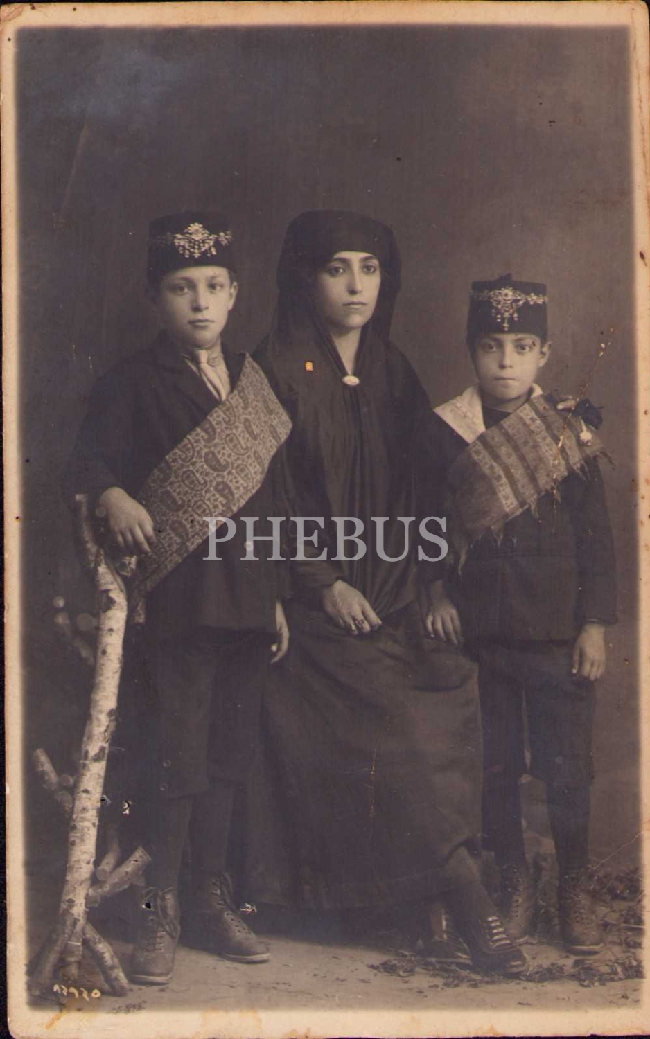 Özel kıyafetli iki erkek çocuğu ve anneleri, Osmanlıca Foto Resne mühürlü, yıpranmış haliyle