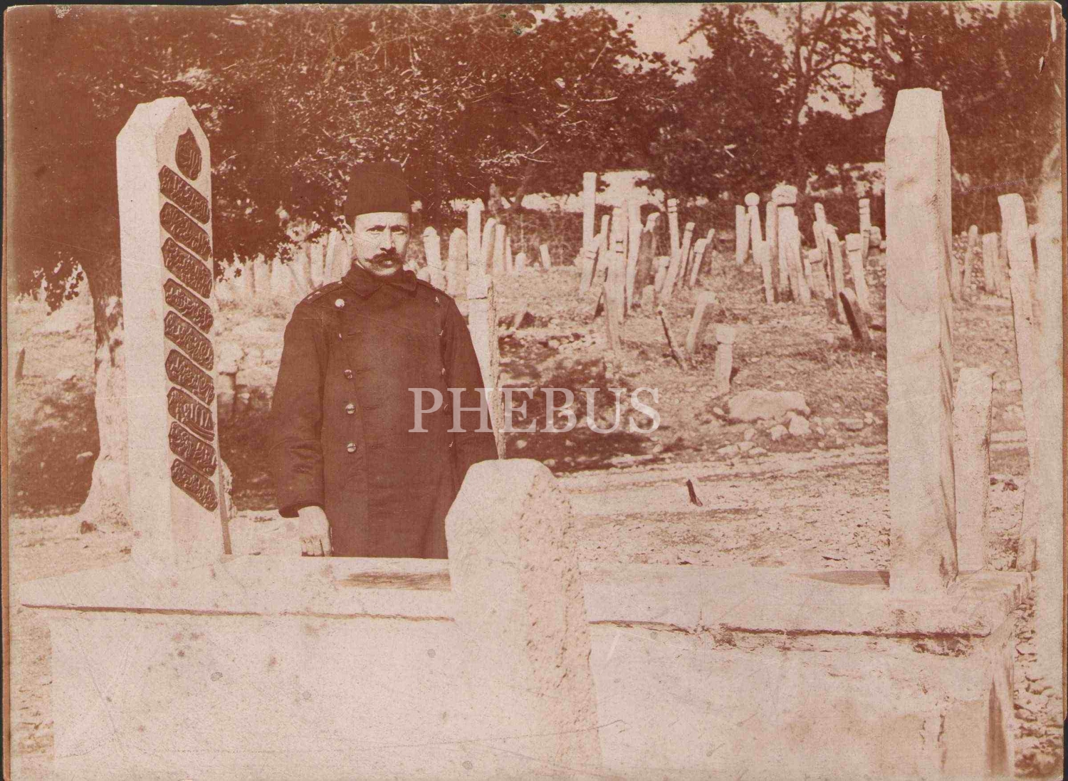 Osmanlıca mezar taşı başında poz veren beyefendi, kartona yapışık, 15x20 cm, kartonu hafif yıpranmış haliyle