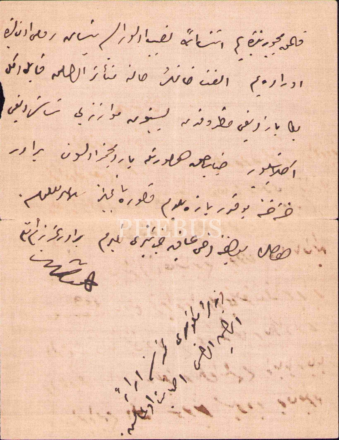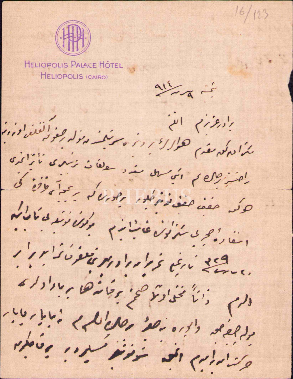 Heliopolis Palace Hotel-Cairo [Kahire] inisiyal ve antetli kâğıtta Osmanlıca şahsi mektup, 1914 tarihli, 14x18 cm kenarları yırtık haliyle