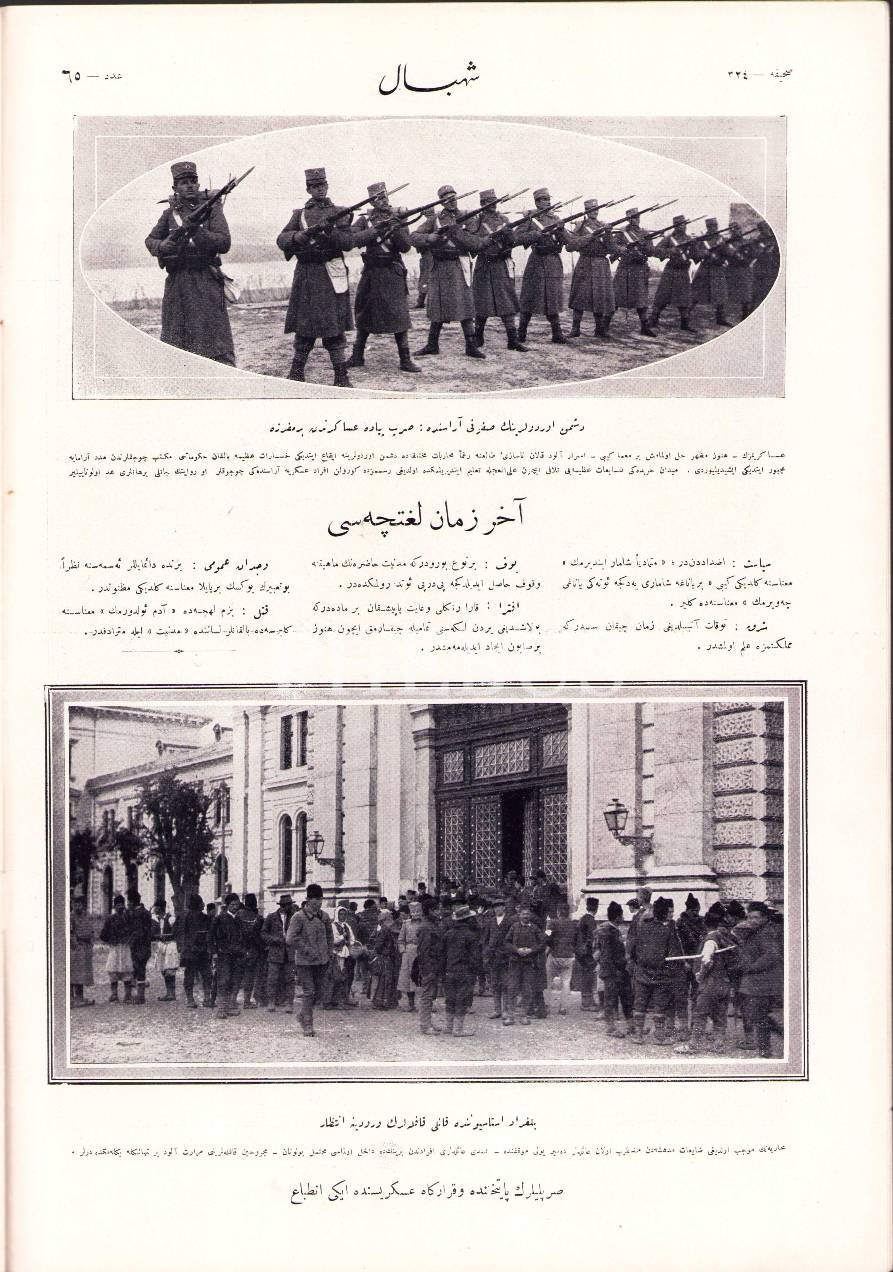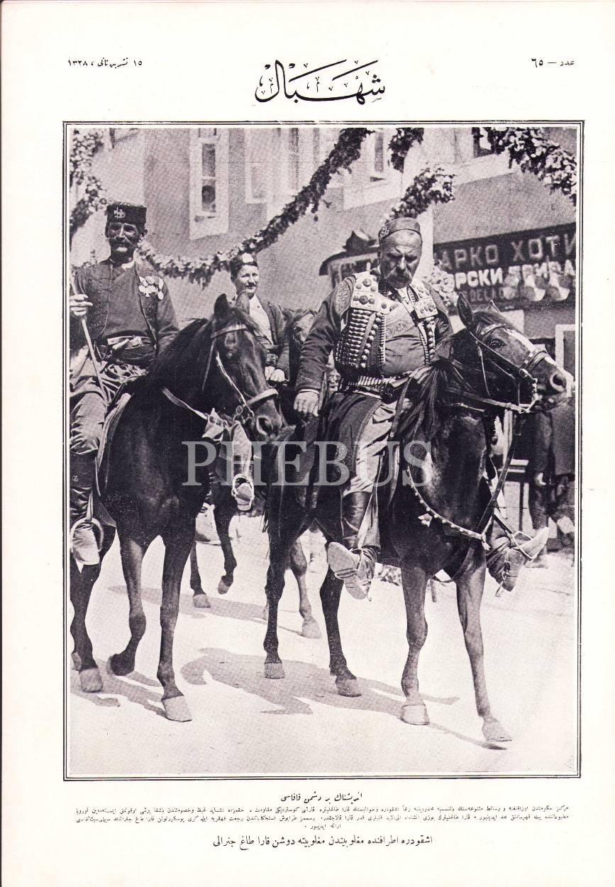 Osmanlıca Şehbal dergisi 65. sayı, 15 Teşrinisani 1328, "İşkodra etrafında mağlubiyetten mağlubiyete düşen Karadağ Generali" yazılı kapak görseliyle, 28x40 cm, sırtı hafif yıpranmış ve son sayfası yırtık haliyle