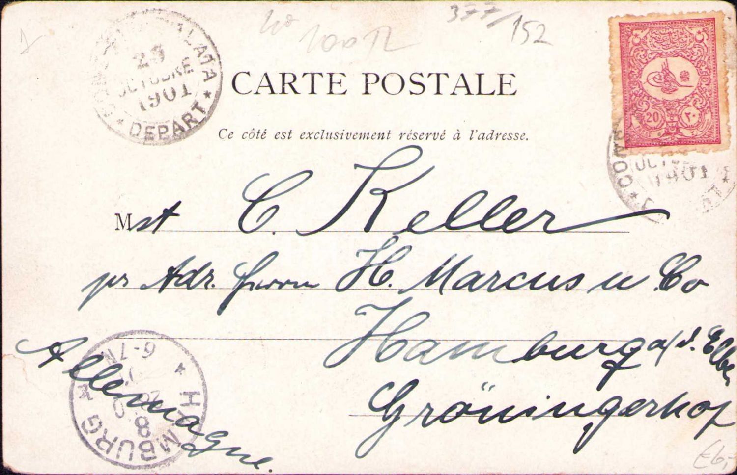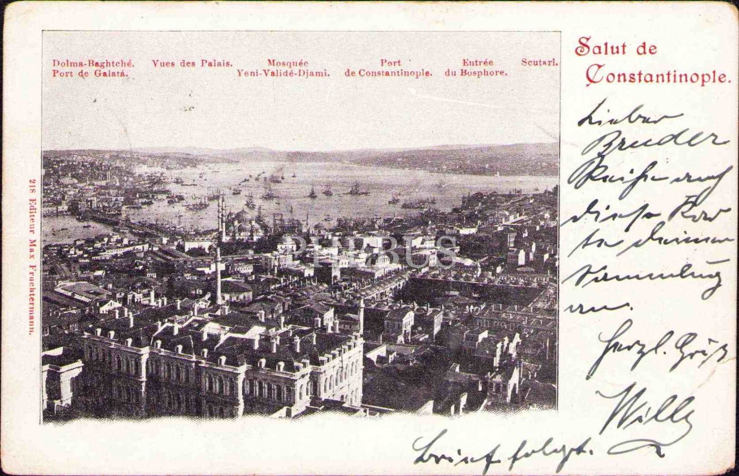 İstanbul manzarası, Constantinople, ed. Max Fruchtermann, arkası yazılı ve postadan geçmiş, köşeleri hafif soyulmuş haliyle
