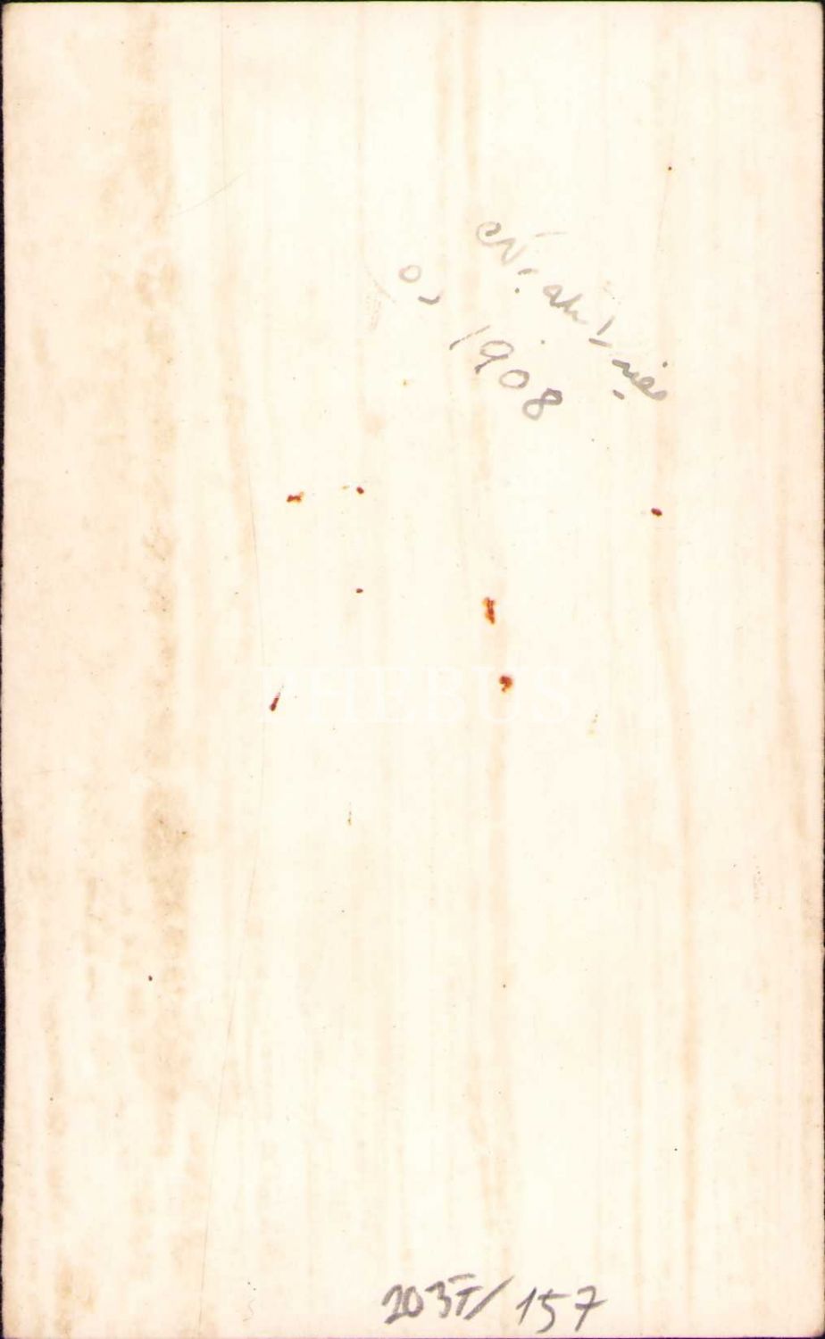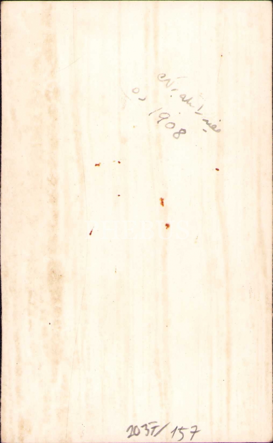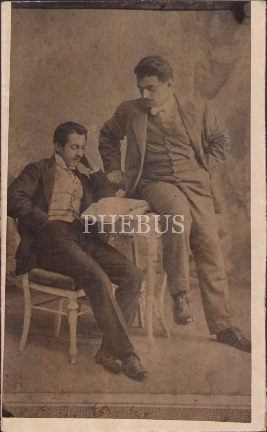 Kitap okurken poz veren iki genç beyefendi, arkası Osmanlıca yazılı, 1908 tarihli, köşeleri hafif soyulmuş haliyle