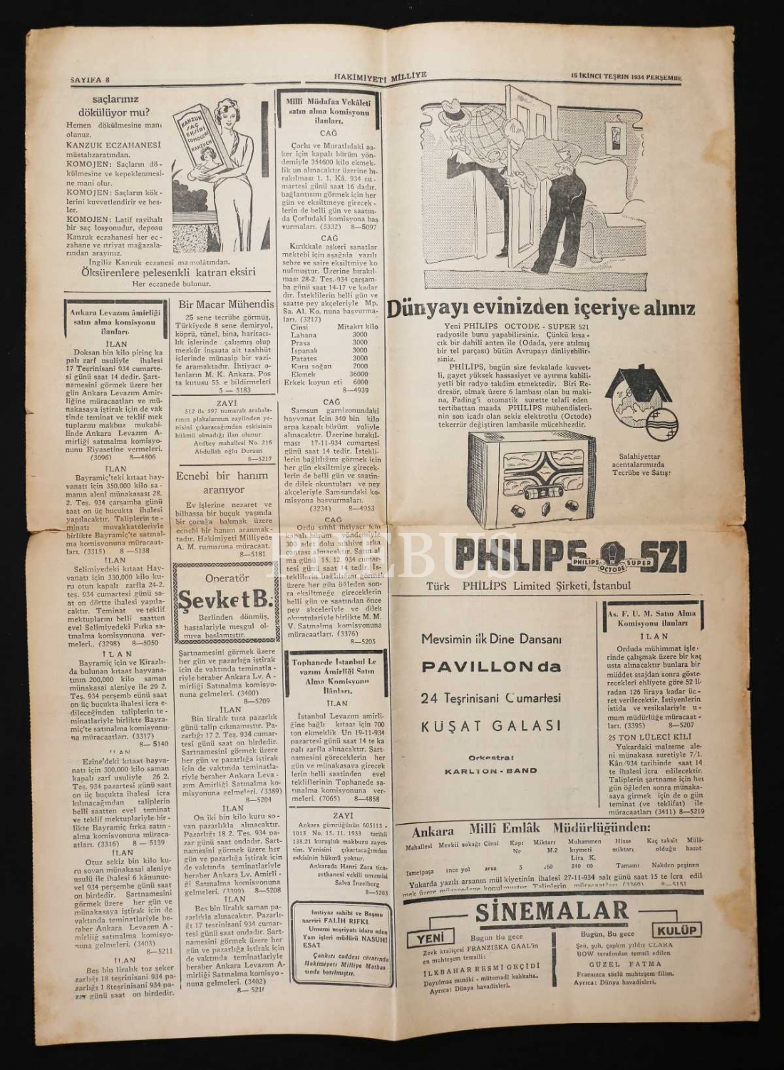 Hakimiyeti Milliye gazetesi, 15 İkinciteşrin 1934, 40x55 cm, hafif yıpranmış haliyle