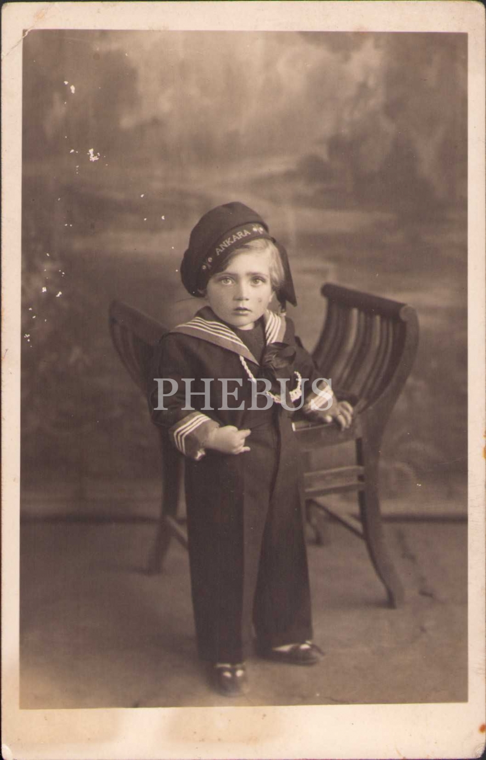 "Ankara" yazılı şapkası ve bahriye üniforması ile poz veren erkek çocuğu, Mehmed Danyal Foto Yıldız-Diyarbekir damgalı, üst köşesi kırık ve yer yer soyulmuş haliyle