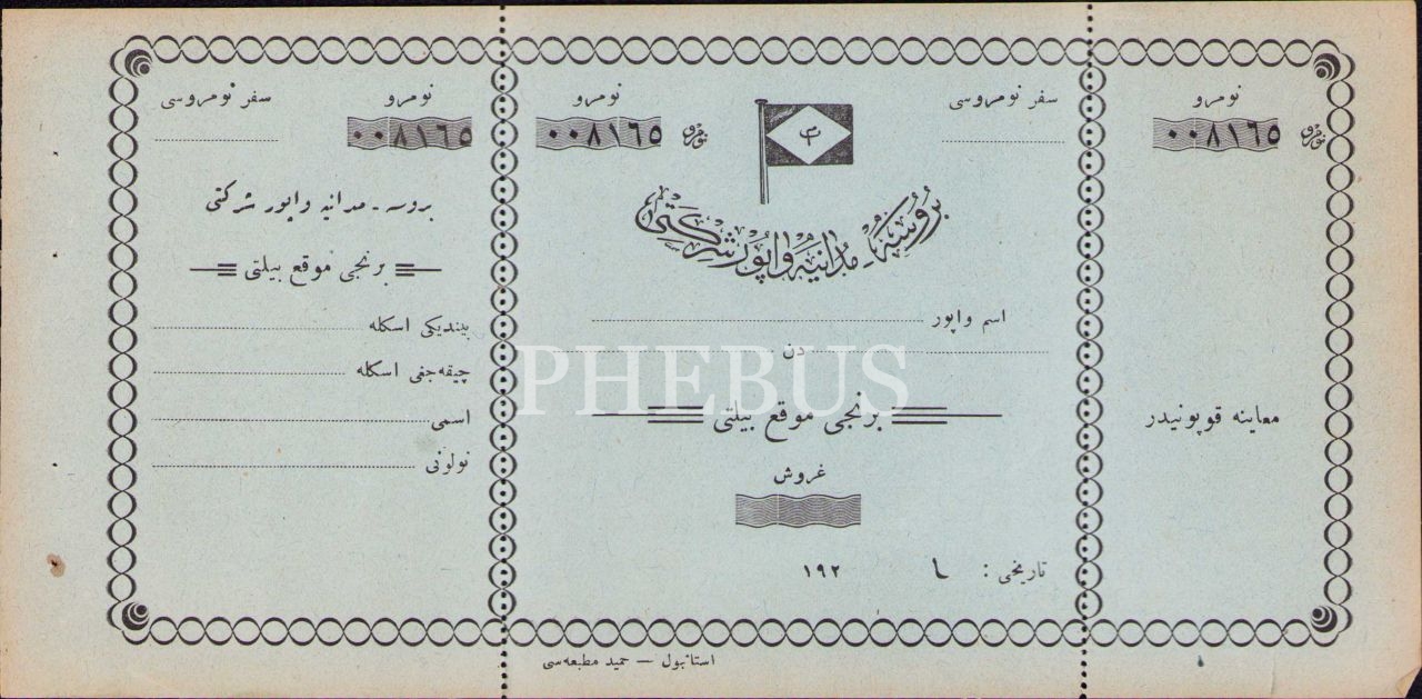 Osmanlıca Bursa-Mudanya Vapur Şirketi boş bileti, 11x23 cm, yırtık ve ufak delikler mevcut haliyle