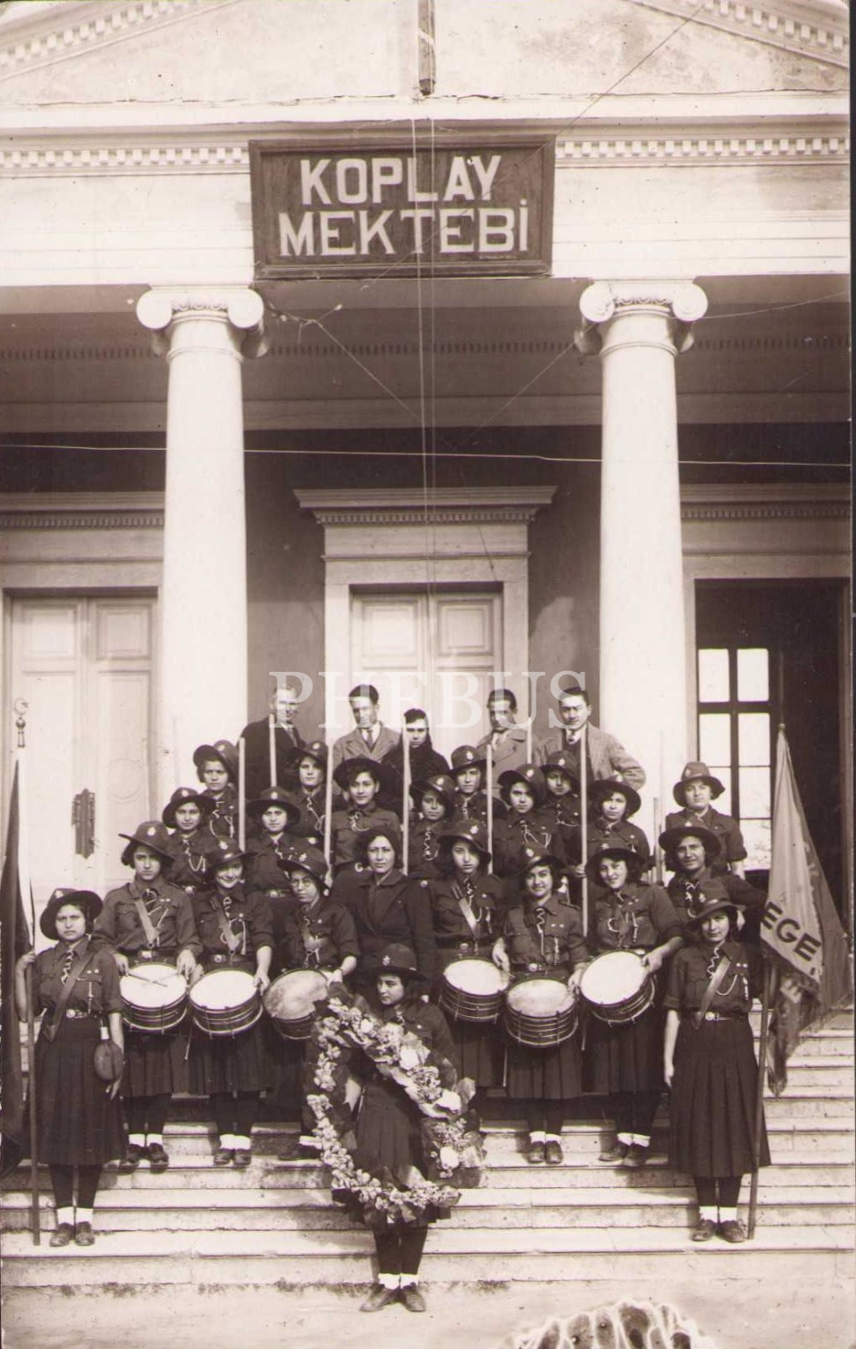 İzmir Kız Sanat Enstitüsü izcilerinin "Koplay Mektebi" tabelası önünde hatıra fotoğrafı, arkası Osmanlıca yazılı, üst köşesi hafif kıvrılmış haliyle