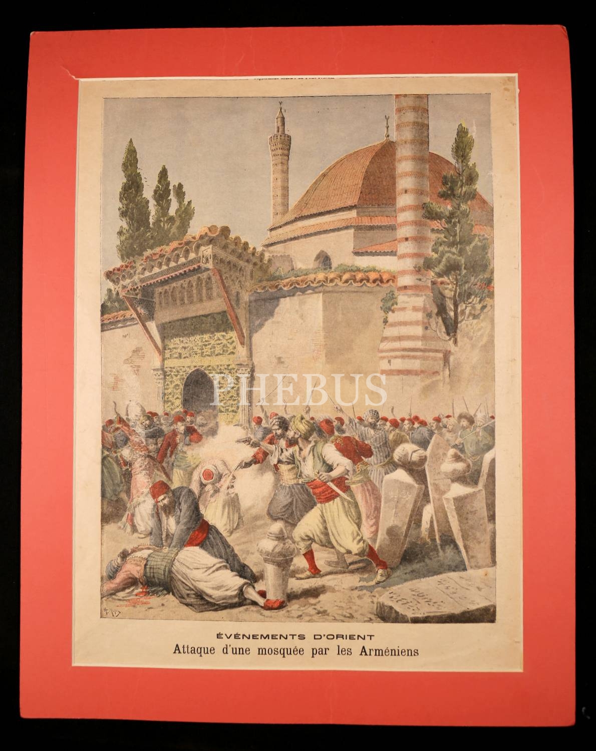 26 Temmuz 1896 tarihli Le Petit Journal dergisi, "Ermenilerin Cami Saldırısı" konulu arka kapak görseliyle, paspartulu, 30x40 cm, dergi hafif yıpranmış haliyle