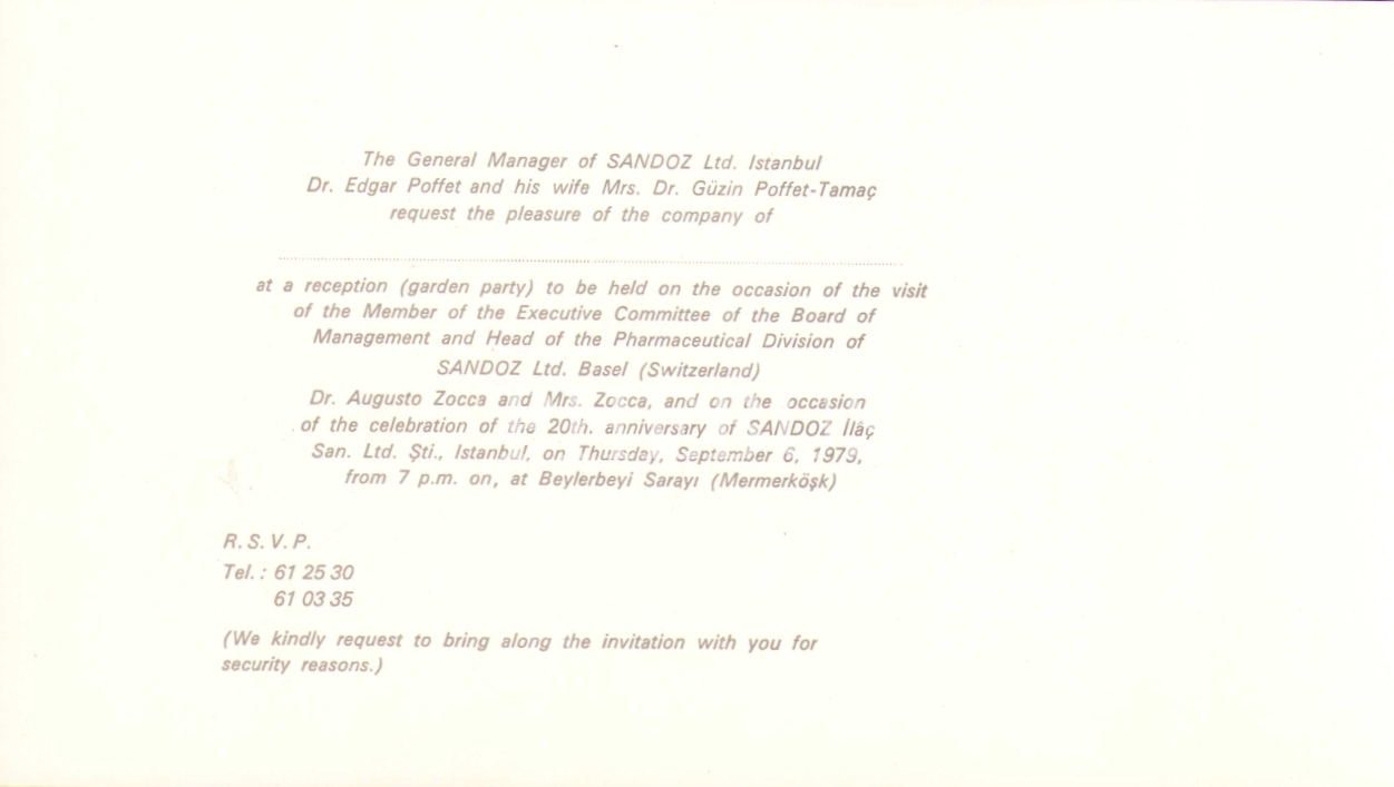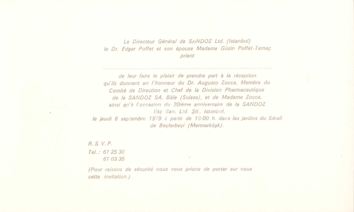 Sandoz İlaç San. Şti'nin Türkçe-İngilizce-Fransızca resepsiyon davetiyesi, İstanbul 1979, 14x62 cm, ortadan kırık haliyle