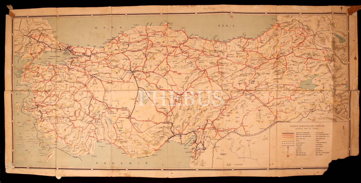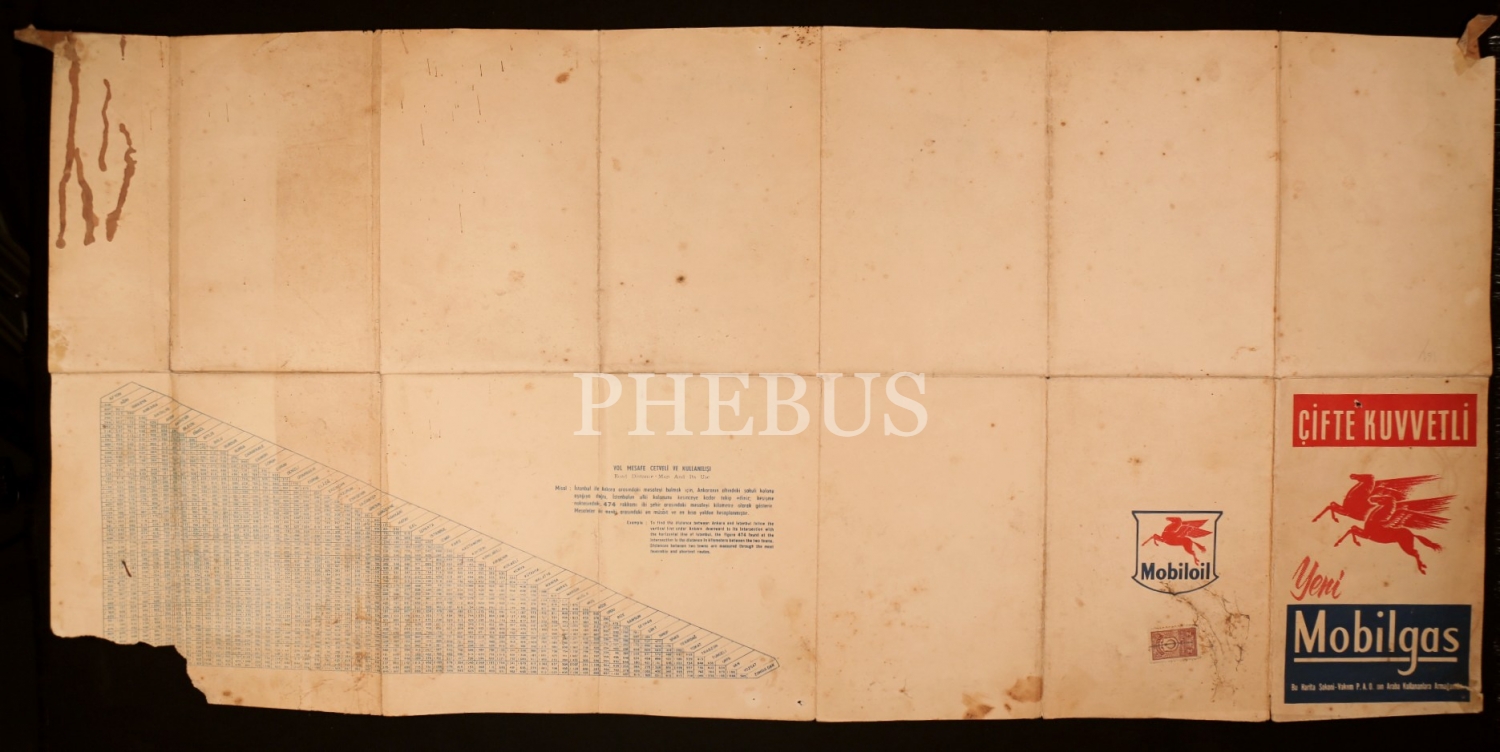 Mobilgas reklamlı Türkiye karayolları haritası, 45x 95 cm, alt köşesi kopuk ve yıpranmış haliyle