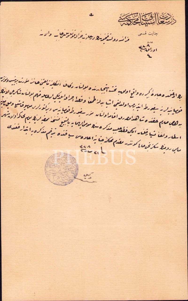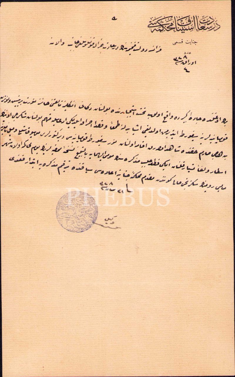Osmanlıca Dersaadet İstinaf Mahkemesi Cinayet Kısmı antetli ve Fransa Başkonsolosluğu'na gönderilmiş evrak, Beyoğlu/İstanbul 1328, 16x26 cm