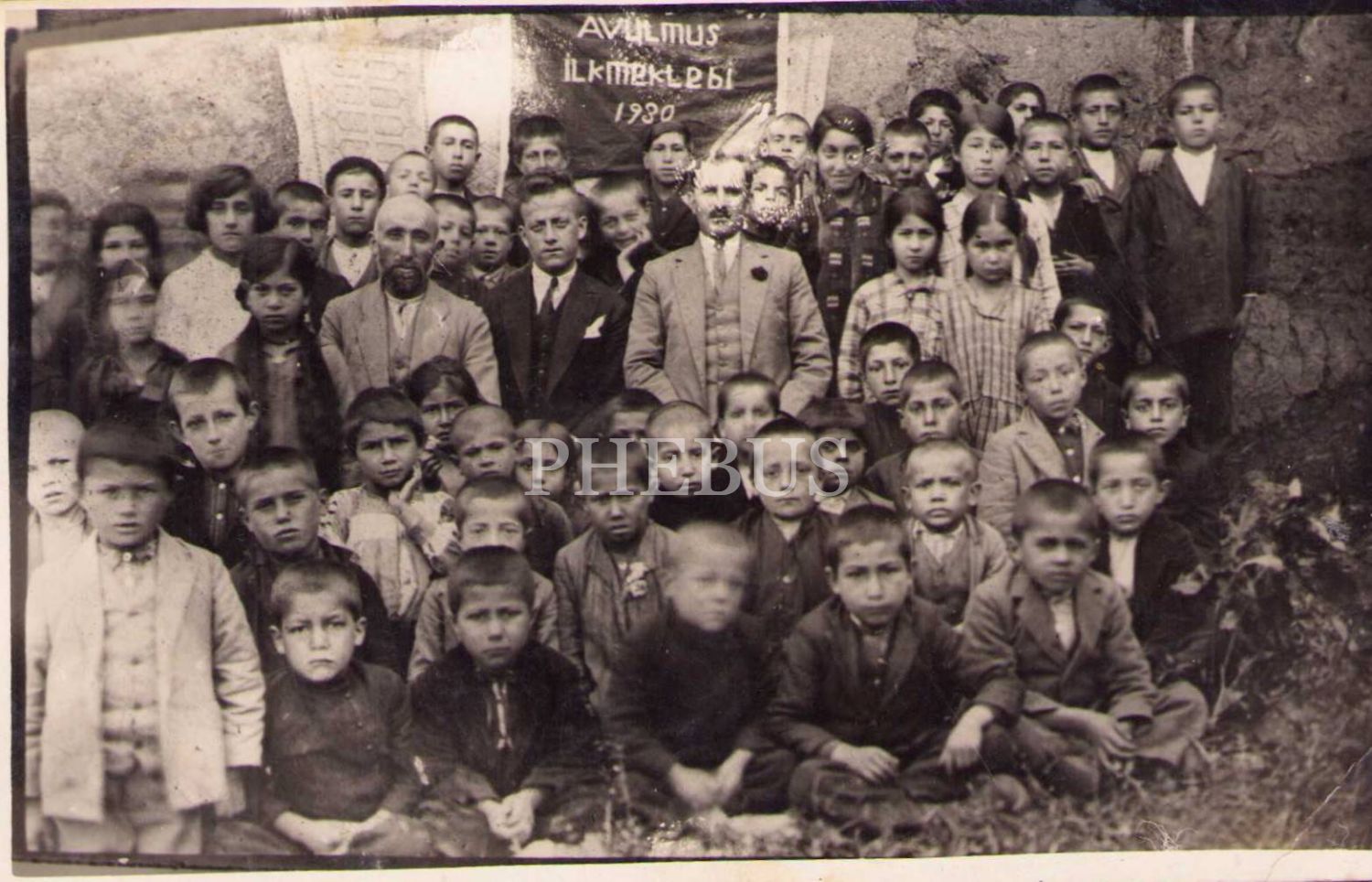 "Avulmuş İlkmektebi 1930" yazısı önünde okul hatıra fotoğrafı, alt köşesi kırık haliyle