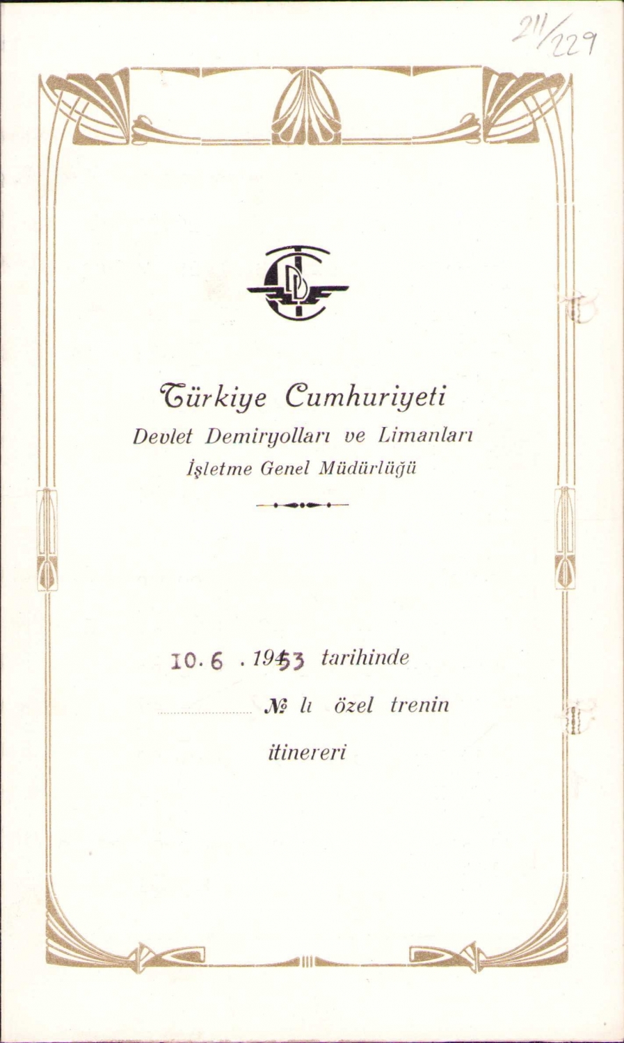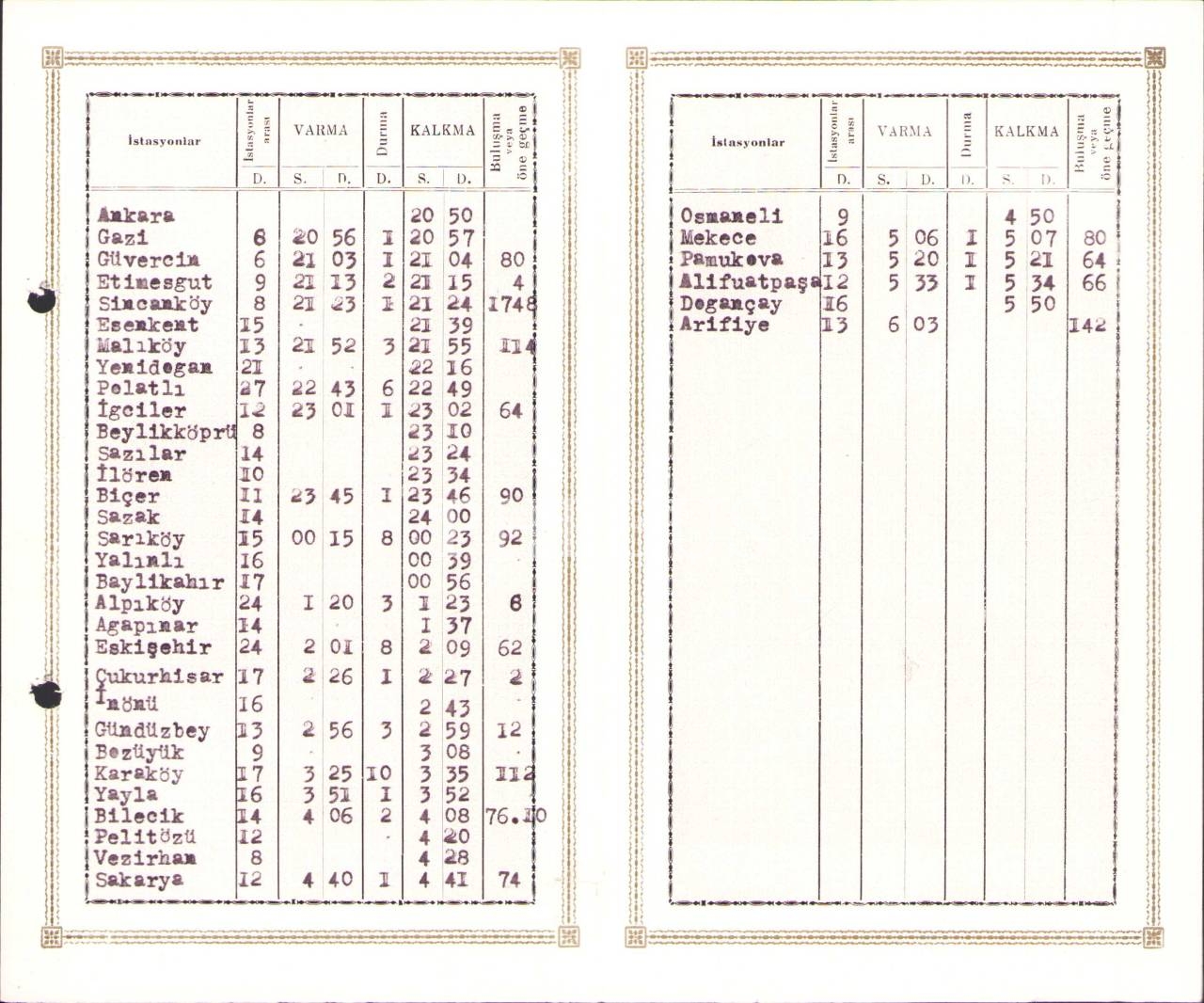 Devlet Demiryolları ve Limanları tren seferleri tarifesi, 1953 tarihli, 12x20 cm, hafif yıpranmış haliyle