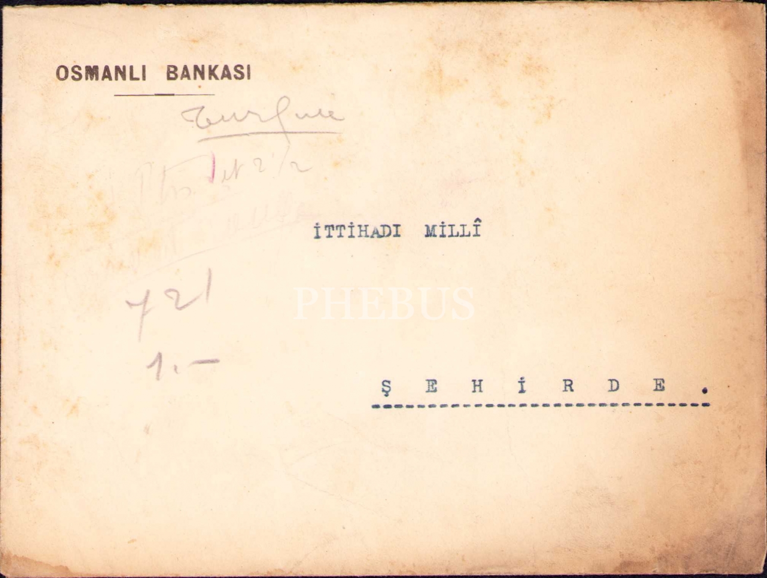 "İttihadı Millî"ye gönderilmiş Osmanlı Bankası antetli zarf, 12x17 cm, yıpranmış haliyle